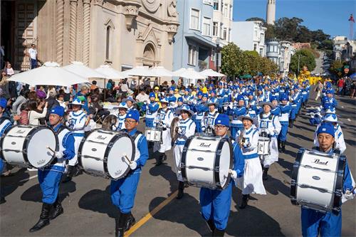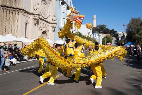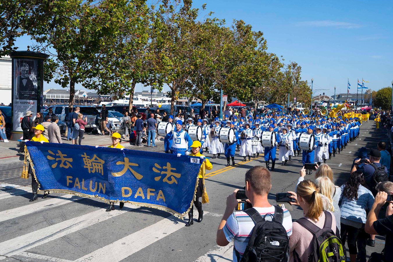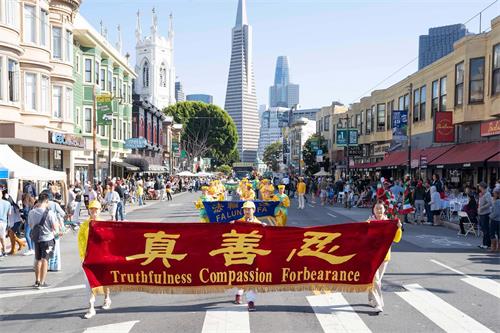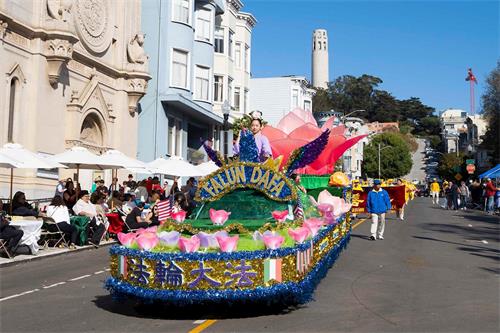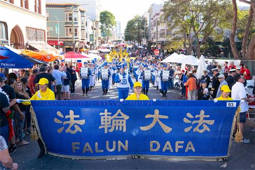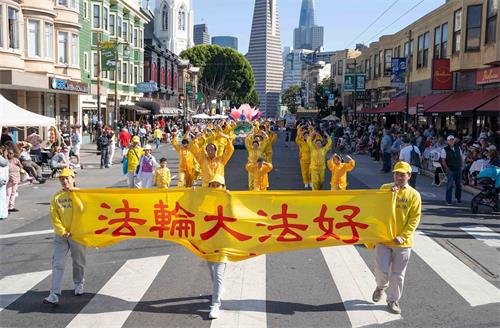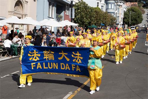 当天,法轮功学员的队伍有美西天国乐团、炼功队、舞龙、花车和腰鼓队,阵容强大。他们所到之处受到观众的喜爱。观众们有的向法轮功学员的队伍挥手致意,有的鼓掌拍照,有的和学员击掌。他们表示,法轮功的队伍非常壮观,为旧金山带来美好。