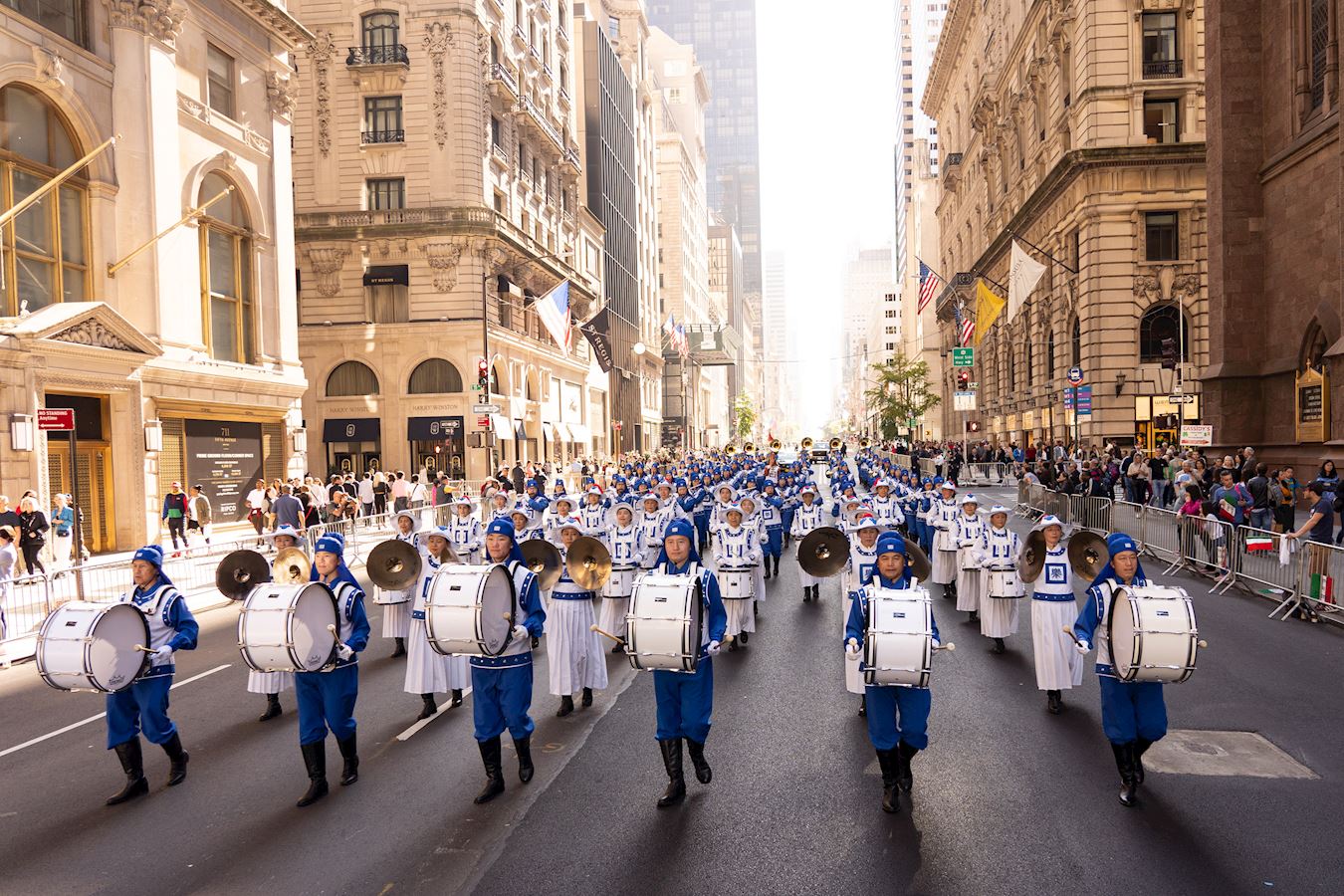【明慧网二零一九年十月十六日】二零一九年十月十四日,纽约第五大道上人声鼎沸,第七十五届纽约哥伦布日大游行(Columbus Day Parade)盛大举行。这是全美最大的意大利节日庆典。今年游行队伍更胜往年,多达四万多人参与,吸引大约一百万名观众。由法轮功学员组成的天国乐团也参加了这个游行。