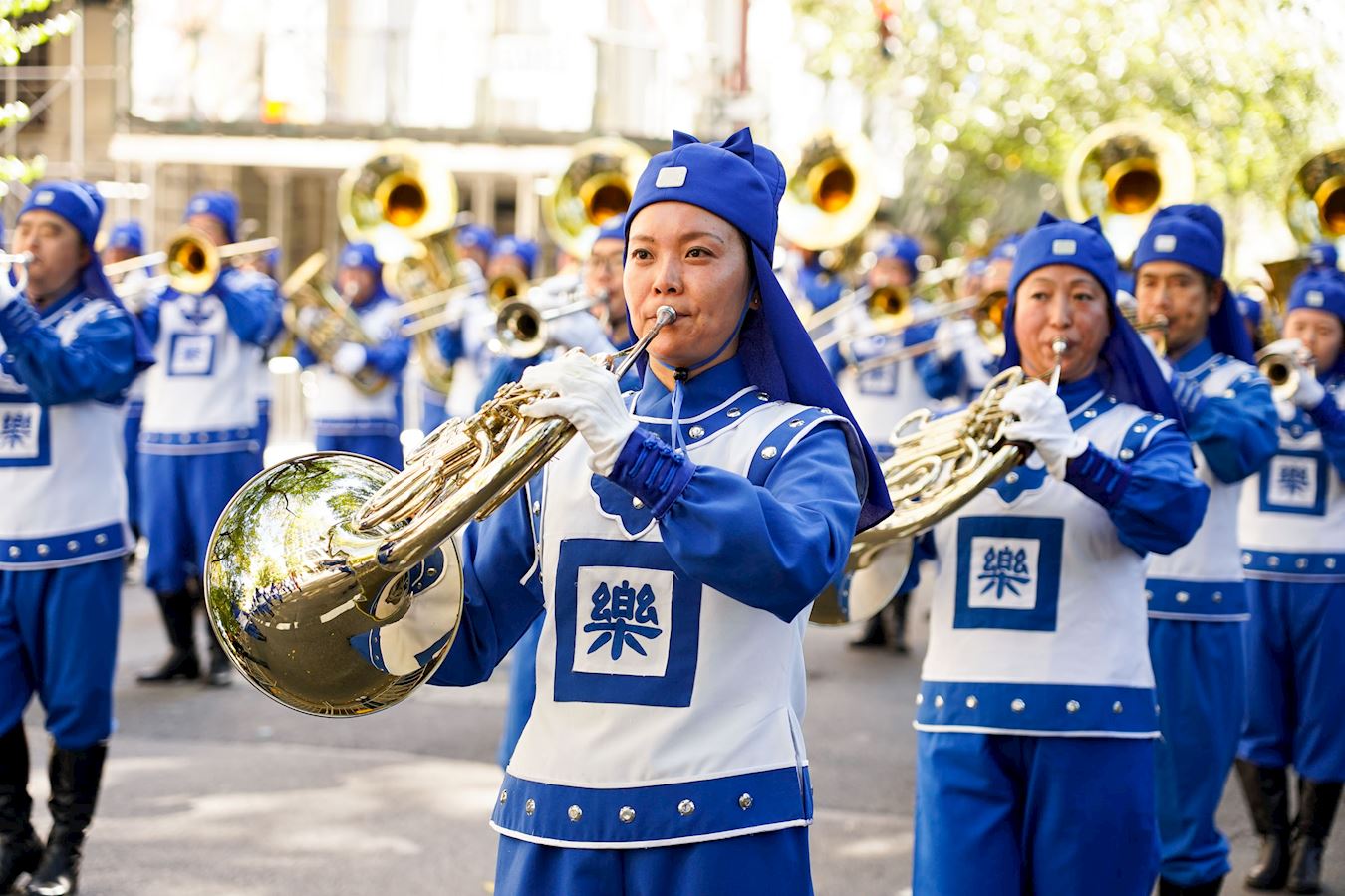 由法轮功学员组成的“天国乐团”在游行队伍中备受瞩目,他们身穿中国古装,脚穿长靴,踏着整齐有力的步伐,气势轩昂,如天兵天将下凡,为观众带来多首乐曲,如“法轮大法好”、“凯旋”、“神圣的歌”、“法鼓法号震十方”、“法轮圣王”、“送宝”,以及广受美国民众欢迎的美国国家进行曲——“星条旗永不落”。