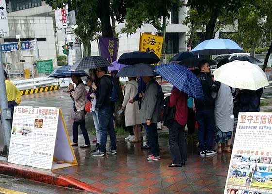 法轮功学员常年坚持在台北国父纪念馆摆展板,讲真相,风雨无阻,帮助很多游客了解了法轮功真相。