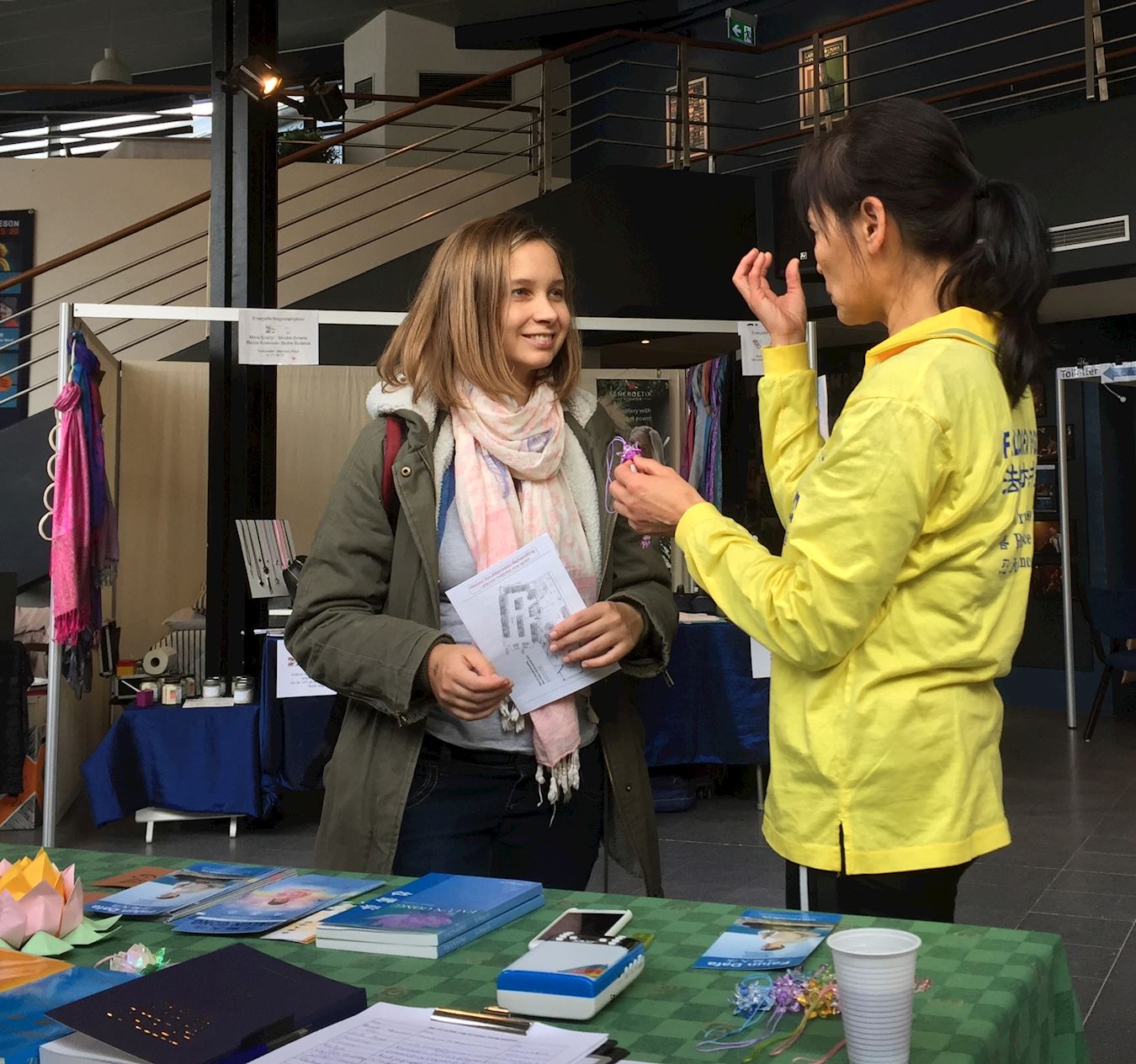 法轮功展位对面的参展商玛晨(Marchen)感受到学员炼功时的能量场。她抽空过来和学员交谈。玛晨很认同“真善忍”理念,她感叹:“法轮功这么好,而且网上资料、现场教功全是免费。”她准备在自己居住的城市找个公共场所,请学员来办介绍会和教功。“最少多少人,最多几人安排一次?”她热心、考虑周到,问清情况后,她与法轮功学员互通了联系方式,期待尽快落实。