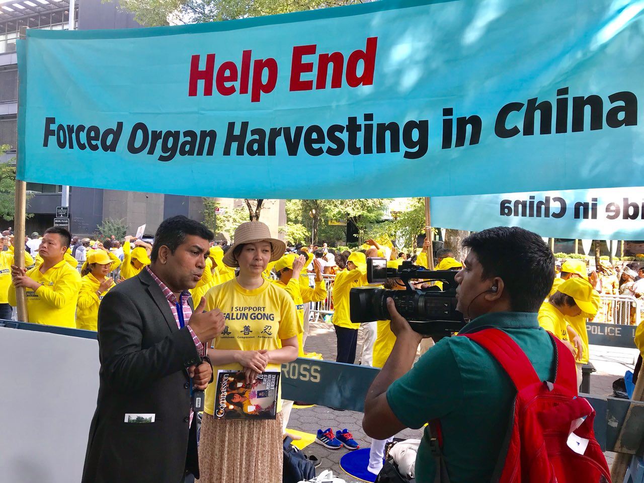印度记者在镜头前对电视观众说,“大家好,我代表TV9 Bharatvarsh,我们是来自印度的一个新节目。我们来到这里做联合国峰会期间法轮功团体请愿的后续报导。”