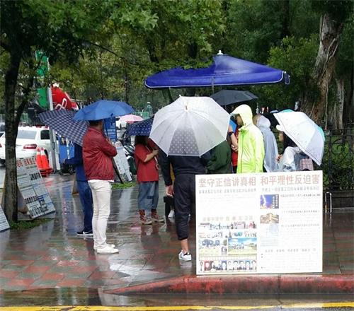居住于附近的邱先生冒雨而来:“我就是知道你们法轮功会来,风雨越大越要来,这就是坚持!这个精神是最了不起的!所以你们这个点一定要有人在,我很佩服你们,我就是来给你们打气的!继续加油!”