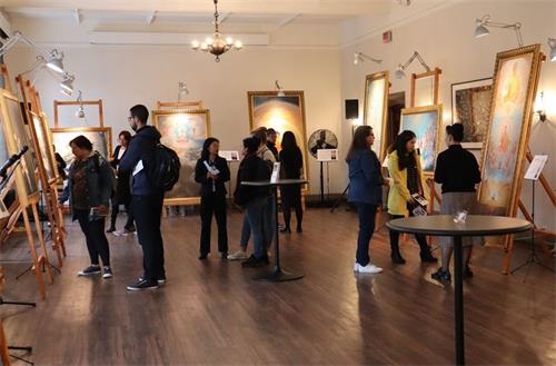 图1~5:二零一九年十月十六、十七日,“真善忍国际美展”在加拿大多伦多大学进行了为期两天的展览,吸引了很多这座知名学府的学生和其他游客前来观看。