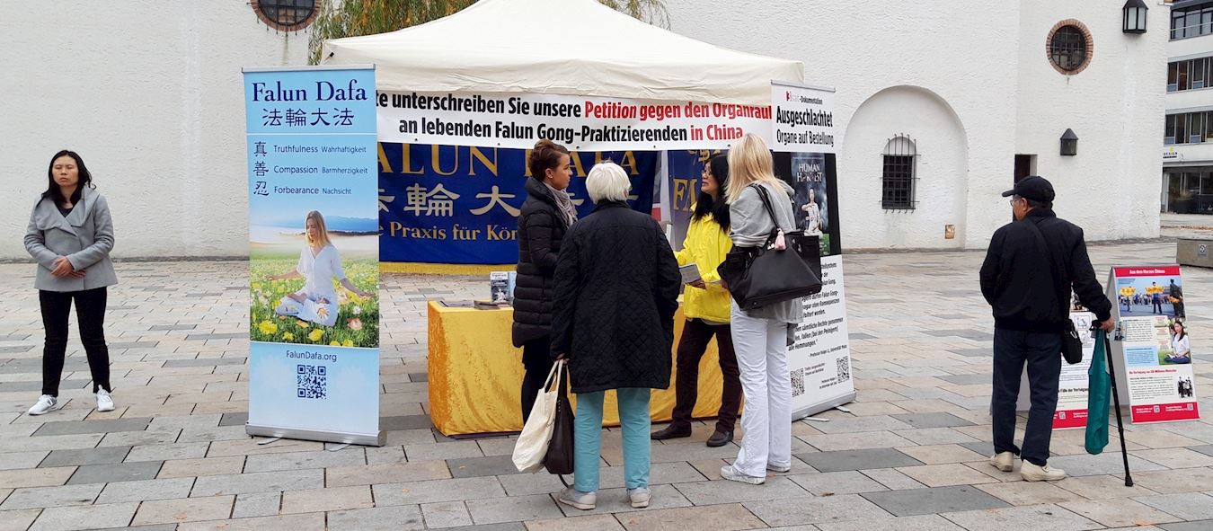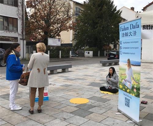有位德国女士看到法轮功学员信息台,主动跟学员攀谈,她很想知道在哪里可以学炼法轮功。她表示自己上周已经签名制止中共强摘法轮功学员器官,“我觉得,如果每个人都从一点小事开始做起,只要迈出一小步,另外的人跟上也迈出一小步,最终就能做成大事,所以我就签了名。”