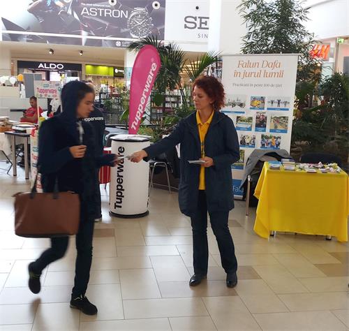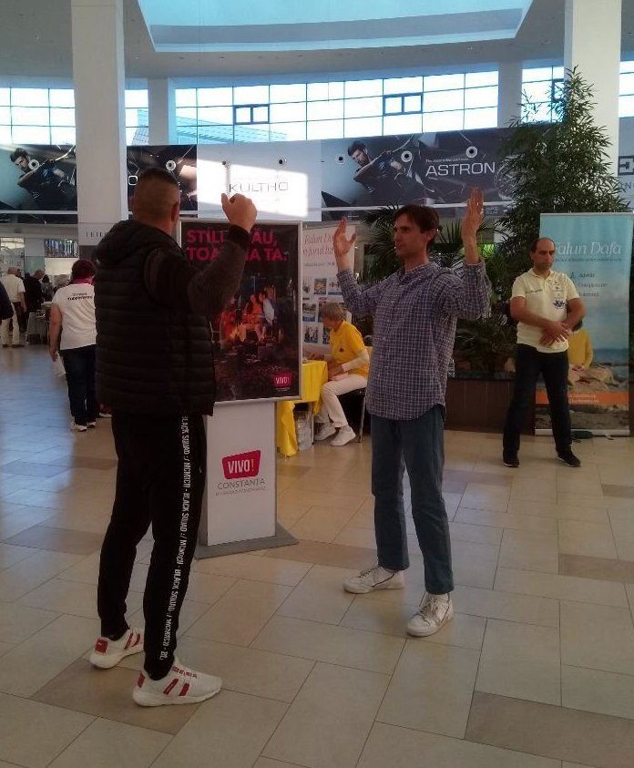 年轻的埃琳娜(Elena)在按摩椅后面发现了别人遗留下的法轮功传单。她立刻去找到了展位了解法轮功。第二天上午九点,她出现在康斯坦察公园的晨炼现场,跟随法轮功学员们一起炼功。炼功后,她表示在以后的生活中要遵循“真善忍”的原则行事。