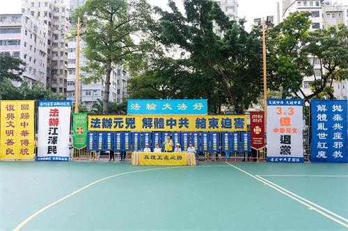香港支联会副主席蔡耀昌及前区议员林咏然到场声援。他们称赞法轮功学员在这关键的日子坚持举办集会,谴责中共及港府在十一当天限制港人集会游行表达诉求。