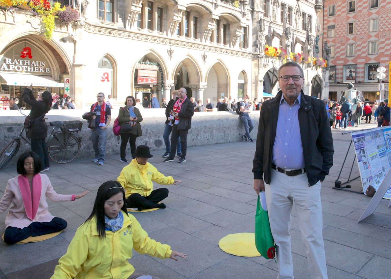 “路过时我感到一股力量,一种感觉让我关注法轮功,也许对我的心灵有好处。”麦克尔先生路过玛琳广场并看到法轮功学员炼功场景时,心里产生了这样的想法。和法轮功学员交谈后,麦克尔先生(Ingo Meckel)签名支持法轮功反迫害,还详细地询问了慕尼黑炼功点的信息,他说路过时我看到人们在炼功和静坐,觉得自己也应该这样。他说,“我是走在灵性道路上的,寻找一切能帮助我达到神圣起源的方法。”