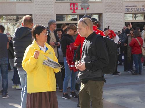 当天在玛琳广场上,法轮功的真相活动吸引了大量民众的关注。有两位台湾中年游客走到信息台前询问法轮功学员,如何为他们捐款。法轮功学员告诉他们,法轮功学员不要捐款,人们可以将法轮功真相告诉更多的人。那两位游客连声说好,并告诉法轮功学员:“我们全力支持你们。”当天也有不少大陆游客,有些人仔细观看中文展板,有些跟法轮功学员交谈,也有人当场表示退出中共各种组织。