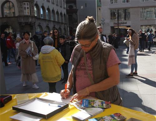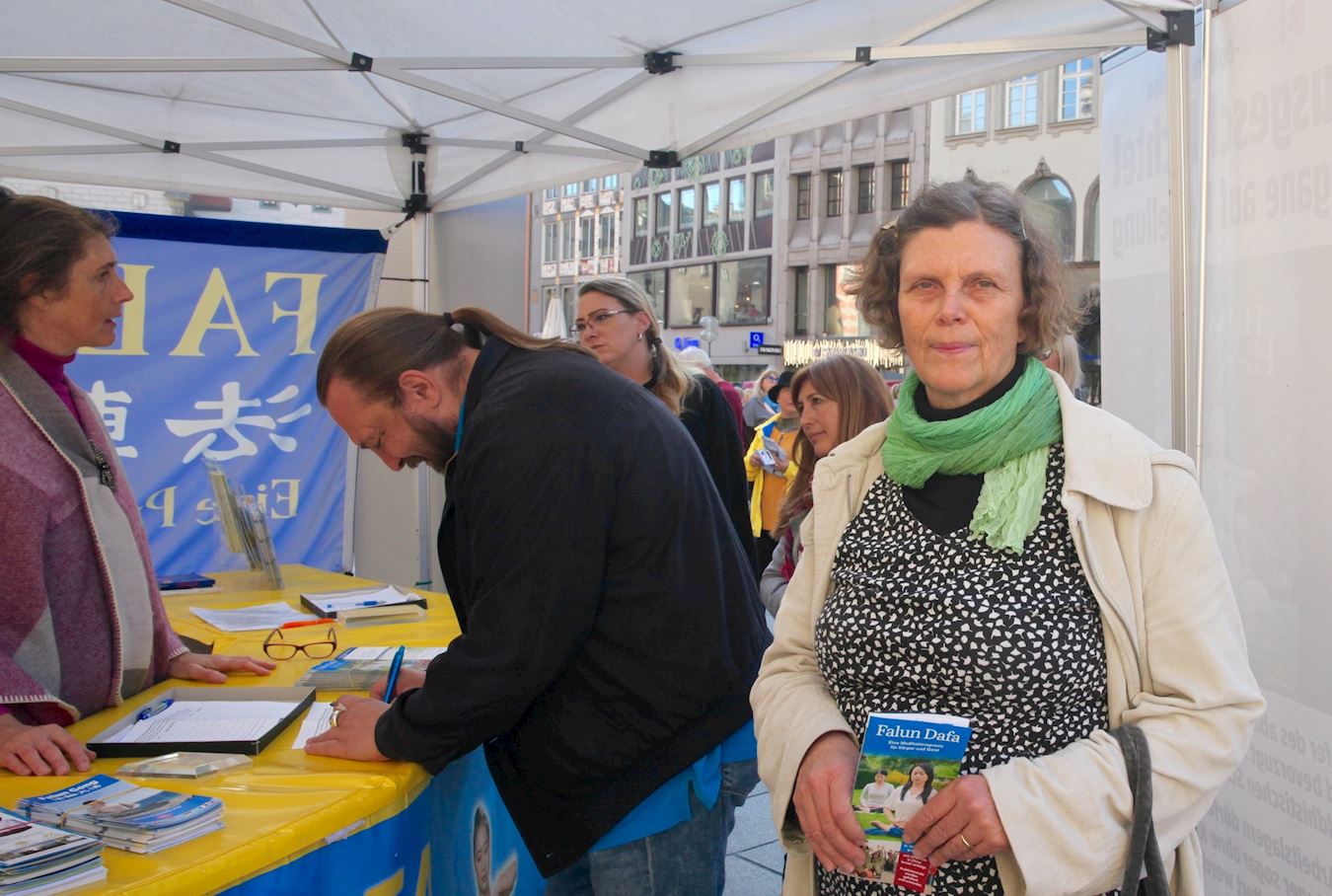 来慕尼黑旅游的德国人波恩斯登格尔女士(Bohnstengel)签名之后表示,“我觉得在那里发生的事情(中共活摘法轮功学员器官)是犯罪。”当她了解到法轮功学员在中国仅仅因为修炼真、善、忍被迫害时,她说:“这太不像话了,太可怕了。怎么说呢,如此侵犯人权简直太糟糕了。每个人都有生存的权利。”