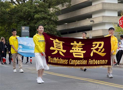在游行队伍中,年轻的法轮功学员手持横幅,在悠扬的乐声中随着游行队伍缓缓前进。有一名法轮功学员跟随游行队伍向观众发放真相资料。