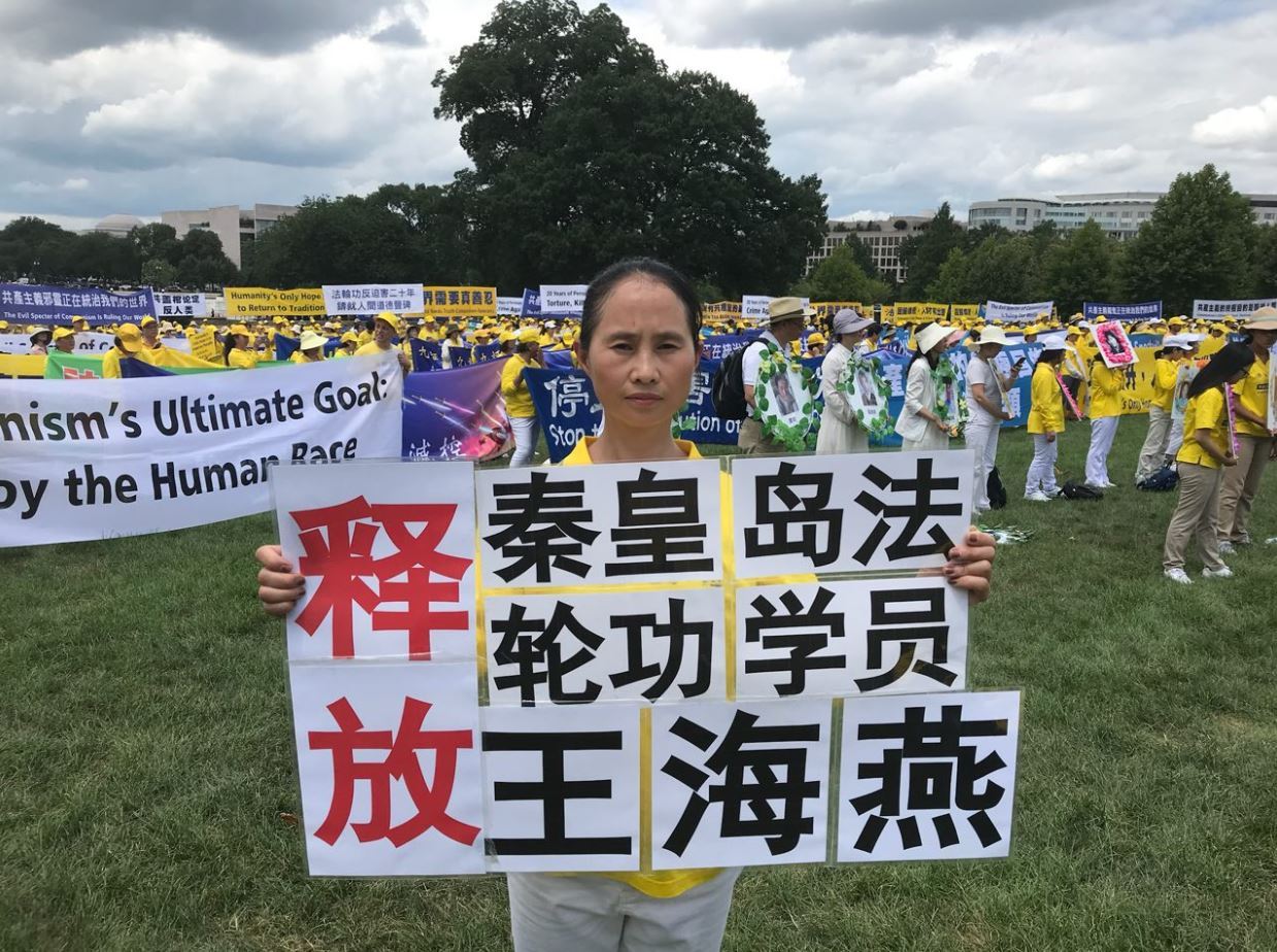 图2:2019年7月18日,吕彩云在华盛顿DC法轮功学员反迫害二十周年集会现场,呼吁营救小姑王海燕。