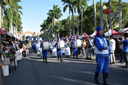 下午三点,举行另一场游行活动,法轮大法社为压轴队伍,法轮功学员组成整齐盛大的天国乐团,身着古典的中国唐朝乐官服饰,演奏充满动感和活力的乐曲,为人们扫掉阴霾,观众展露欣喜之情。江山青同学说:“天国乐团游行过后,人们似乎更明白了法轮大法的美好,非常多人签名举报江泽民反人类罪行。”