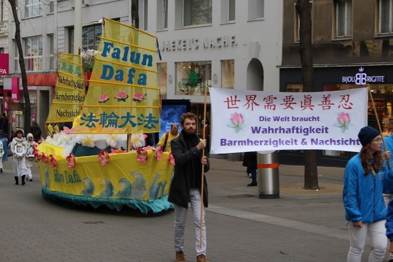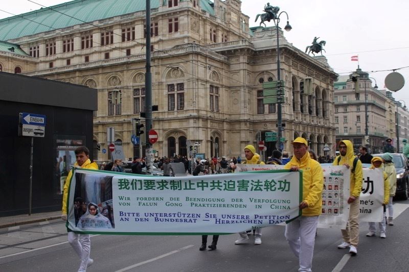 游行队伍环绕维也纳内城区,经过诸多著名的景点,让众多路人和来自世界各地的游客驻足,人们纷纷拿起手机摄影录像留念,有的还和发送传单的法轮功学员交谈,了解更多详情。