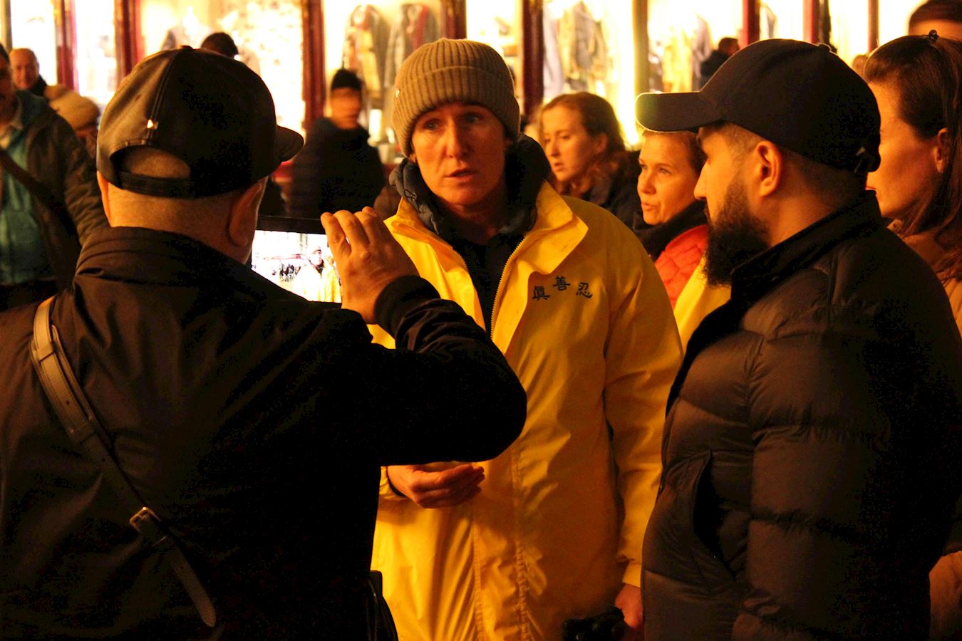 来自各国的游客,包括中国游客向学员了解详情,一位俄罗斯游客还请学员详细讲解了此次活动的原因和意义,以及什么是法轮功,并全程录像。