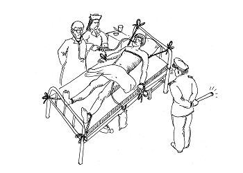 ![]() 中共酷刑示意图:绑在床上灌食 |