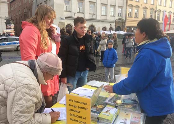 - 多国游客雨中签名 支持法轮功反迫害(图)- 十一月九日至十日,波兰法轮功学员在欧洲著名旅游城市克拉科夫古城中央市集广场及瓦维尔皇家城堡旁举办活动,介绍法轮功。