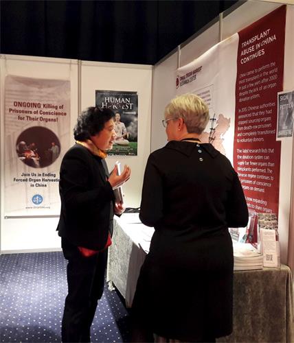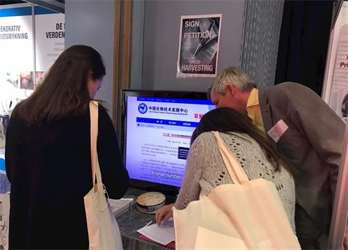 安德斯(Anders)医生在会议中间休息时特意赶到DAFOH展位查询最新进展。他表示,难以置信的是这件事不但没有停止,(中共)他们居然还在谈论增加中国移植医院的数量,他希望可以通过签名呼吁制止这场犯罪,同时也希望可以索取最新的资料以便更详细地了解并带给同事。