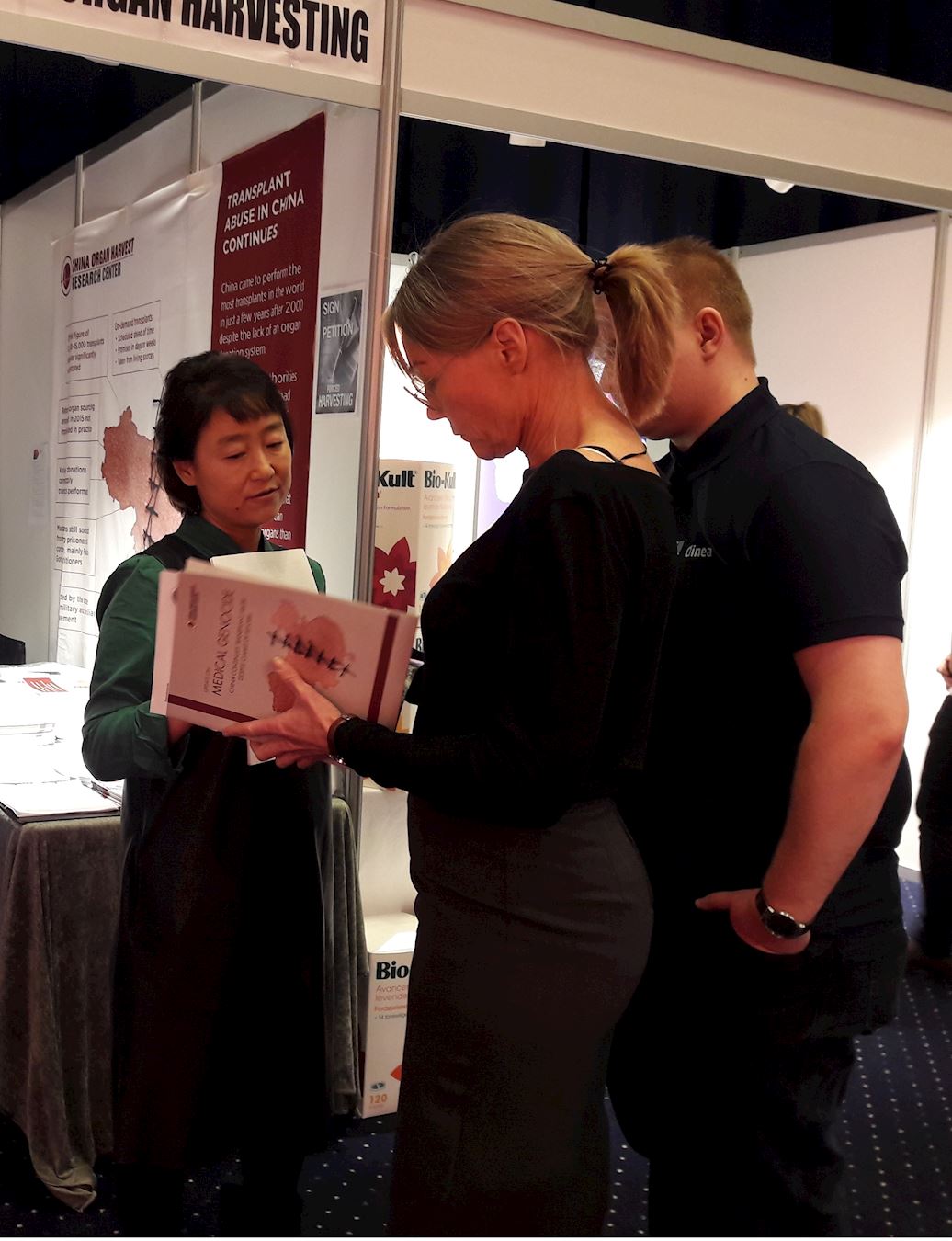 沙哈(Sara)女士是位全科医生,她看到在展位电视上播放的有关强摘的调查和采访,一面搓着手臂一面告诉DAFOH展位工作人员:“这真让人毛骨悚然,而自己之前对这个话题知之甚少。如此严重的事情在信息社会的今天似乎没有被广泛认知,这本身就令人忧心。”