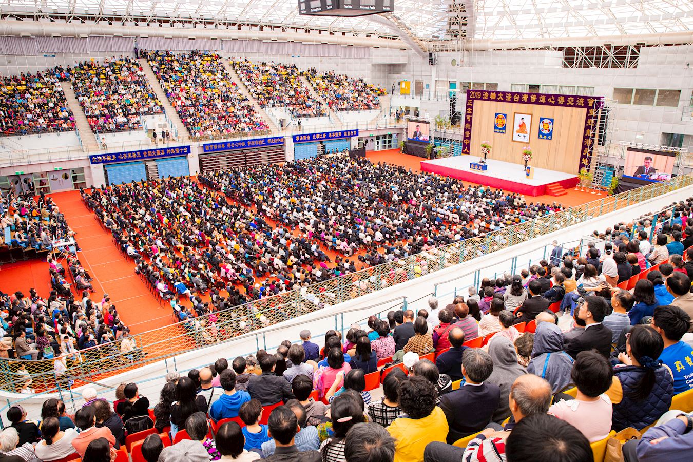 '图1~3:近七千名法轮功学员参与二零一九年十一月十七日台湾法轮大法修炼心得交流会,聆听二十位学员上台交流修炼心得体会,互勉比学比修奋力精進。'