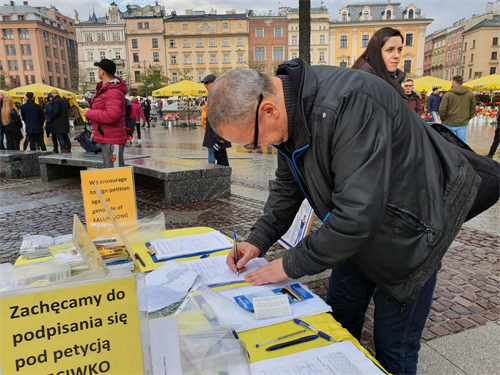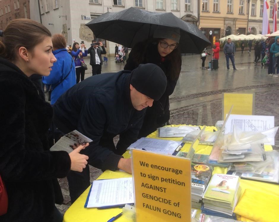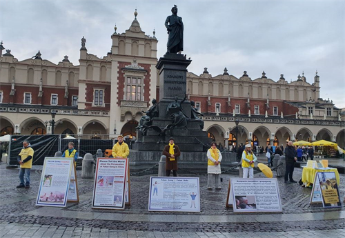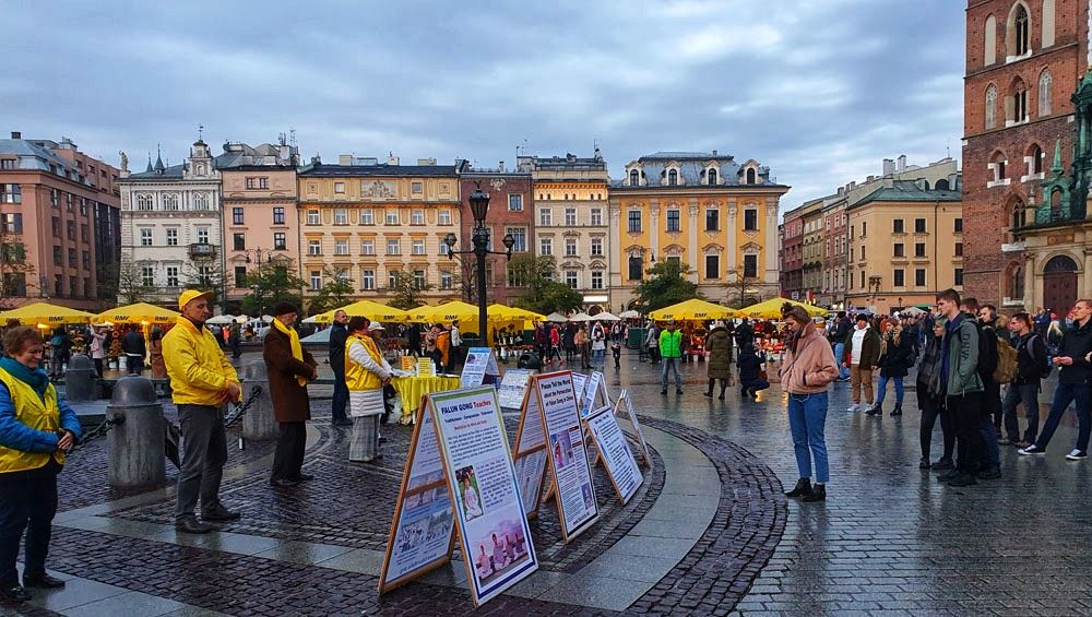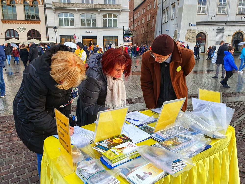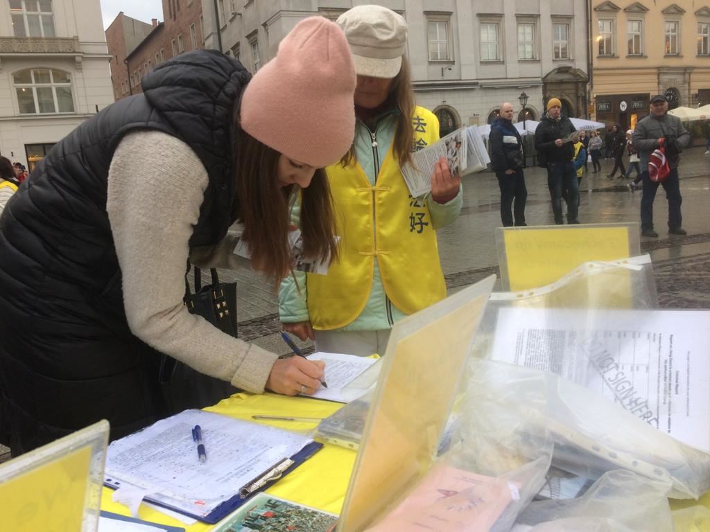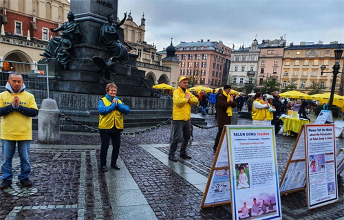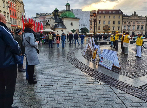 【明慧网二零一九年十一月十八日】二零一九年十一月九日至十日,波兰法轮功学员在欧洲著名旅游城市克拉科夫(Kraków)古城中央市集广场及瓦维尔皇家城堡(Wawel Castle)旁举办活动,介绍法轮功,揭露中共多年来对法轮功群体灭绝式的残酷迫害及活摘器官罪行。多国游客震惊于这些事实真相,纷纷在雨中签署《举报江泽民迫害法轮功之罪行的刑事举报书》及给波兰总理及参众两院议长的《请愿书》,支持法轮功反迫害,抗议中共的邪恶与残暴。