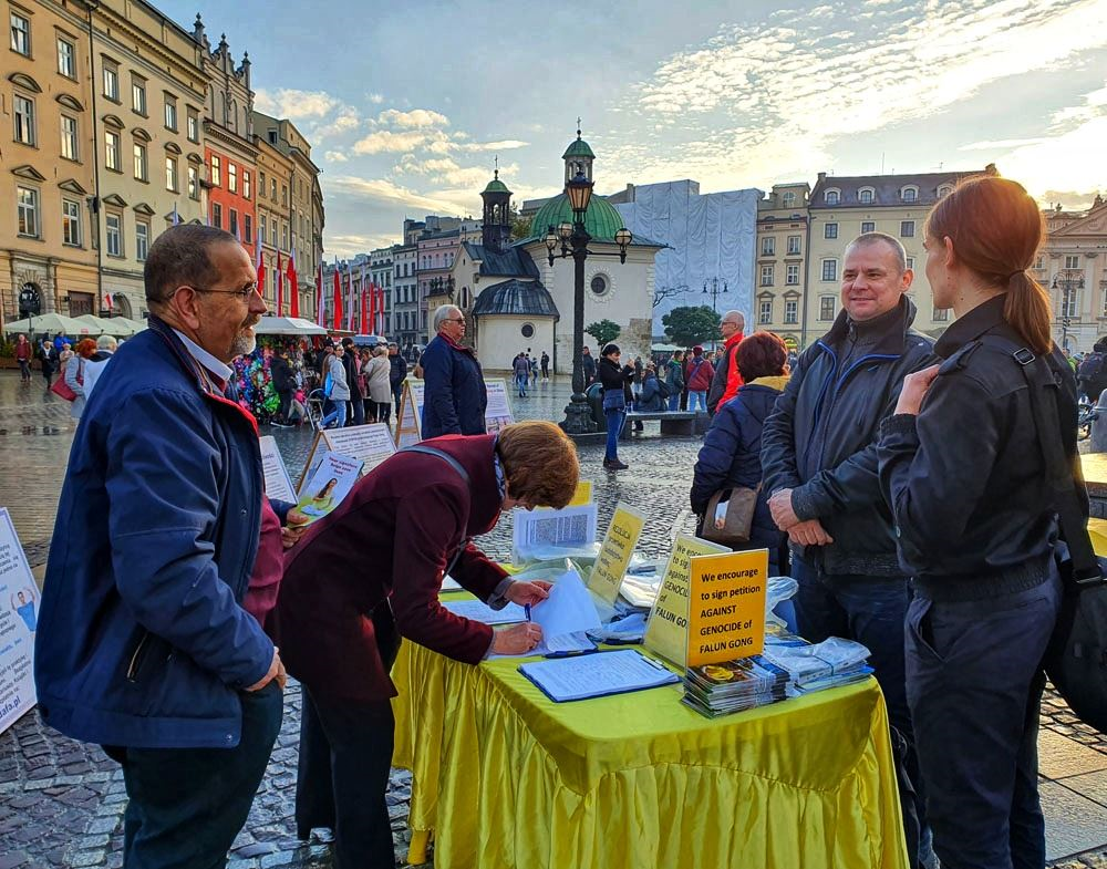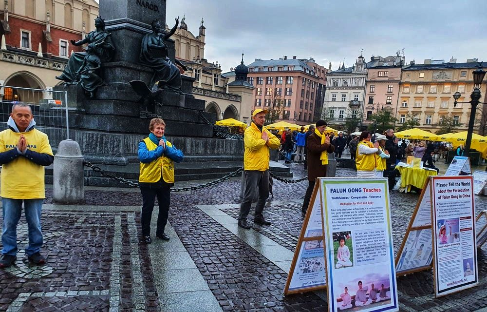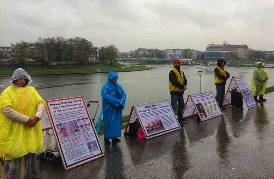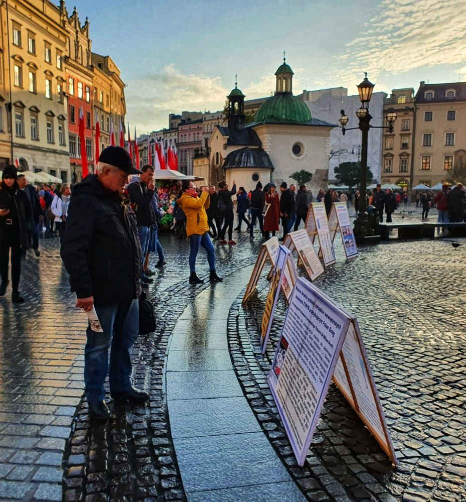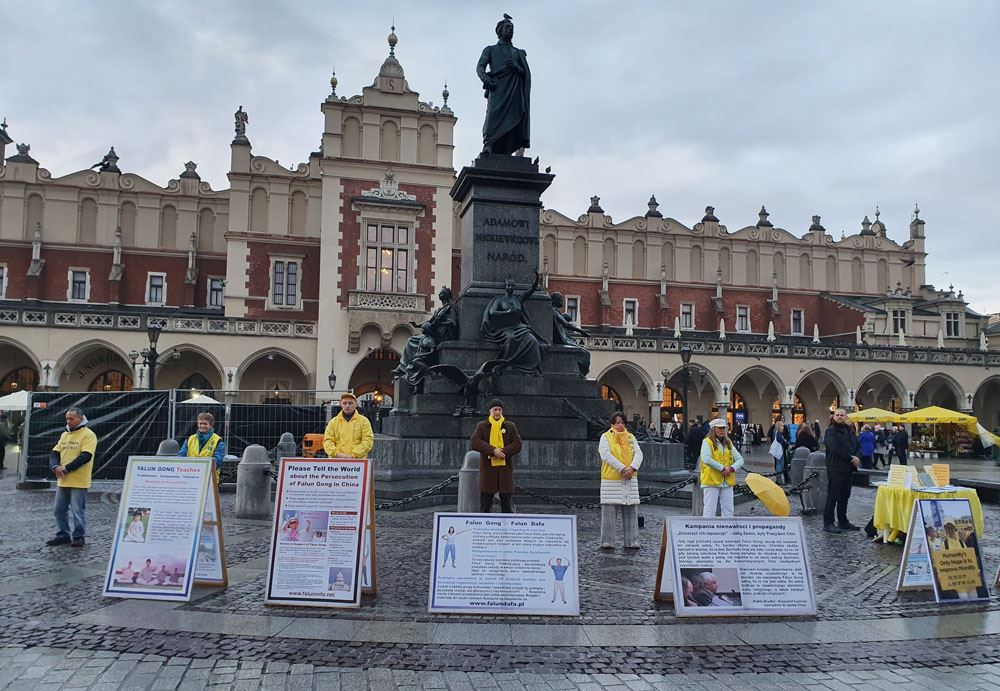 【明慧网二零一九年十一月十八日】二零一九年十一月九日至十日,波兰法轮功学员在欧洲著名旅游城市克拉科夫(Kraków)古城中央市集广场及瓦维尔皇家城堡(Wawel Castle)旁举办活动,介绍法轮功,揭露中共多年来对法轮功群体灭绝式的残酷迫害及活摘器官罪行。多国游客震惊于这些事实真相,纷纷在雨中签署《举报江泽民迫害法轮功之罪行的刑事举报书》及给波兰总理及参众两院议长的《请愿书》,支持法轮功反迫害,抗议中共的邪恶与残暴。