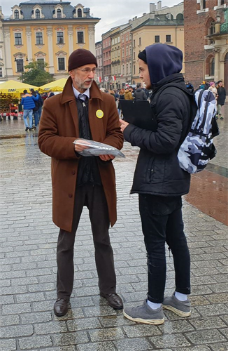 来自克拉科夫的Wademar先生在展板前观看法轮功真相,然后来到征签台前,双手抱拳向法轮功学员鞠躬行礼,他在《刑事举报书》及《请愿书》上签名后说:“我在八十年代就学过中国武术,非常折服于传统的中华文化,今天看到你们炼法轮功,我心里感到非常亲切,闭上眼睛,这喧嚣的广场熙攘的人群就都消失了,心中满满的装的都是你们法轮功音乐,温暖祥和,好安静啊,我一步都不想离开。这么好的功法,怎么还要受到那么严重的迫害。我支持你们,反对中共的迫害,反对来自任何形式的迫害!”