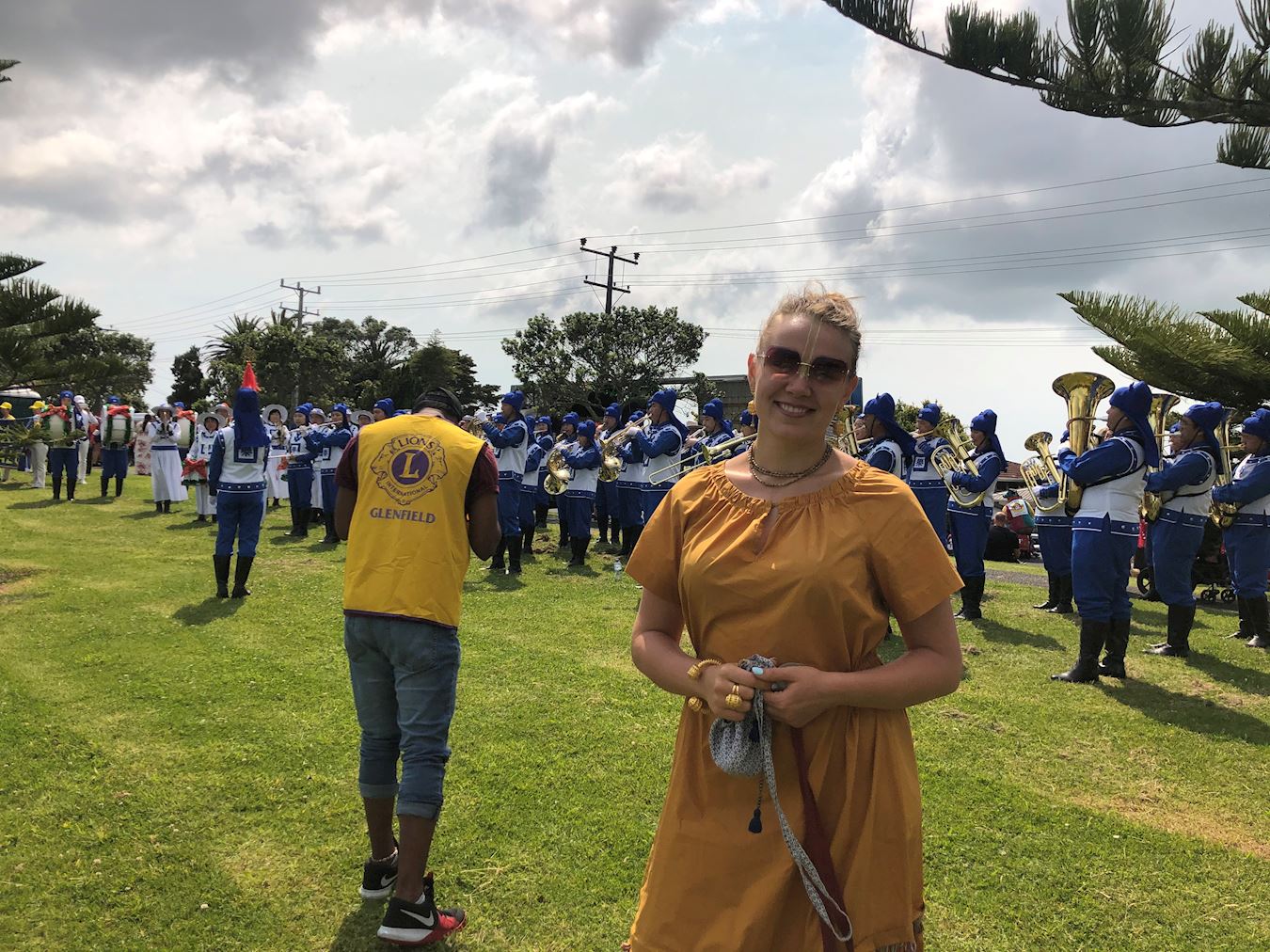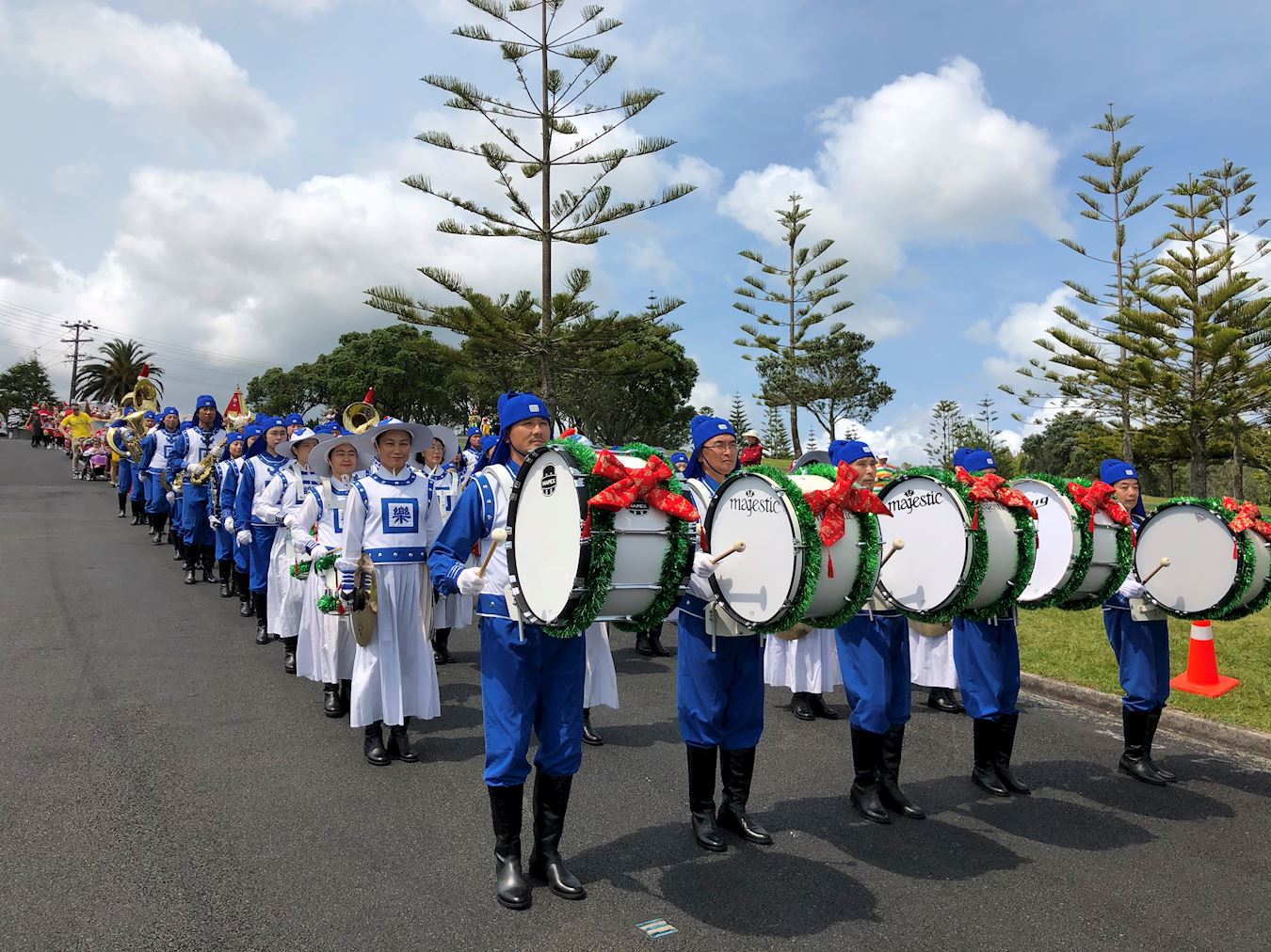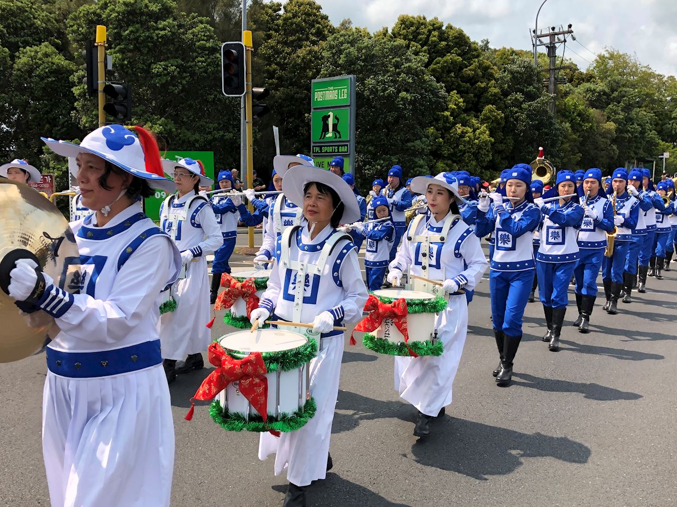 '图1~5:二零一九年十一月十七日,由法轮功学员组成的新西兰天国乐团参加了一年一度的奥克兰格兰菲尔德(Glenfield )区的圣诞游行。'