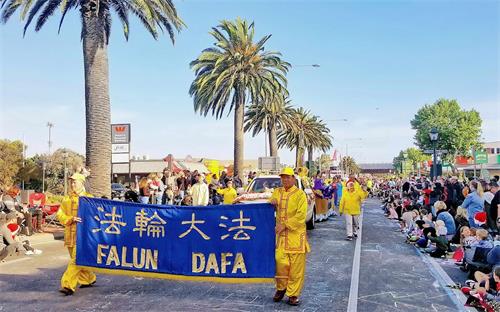 游行时道路两旁都挤满了观众,很多人看到法轮大法队伍时不断挥手、赞叹和拍照,有的还竖起大拇指称棒。主持人介绍说:“看,走过来的是法轮大法队伍。除了美丽的中国古典服装,我们还看到一只金色的花船,它承载着‘真善忍’的重要信息。花船上的每个部件都是由南澳的法轮功学员手工制作的。”