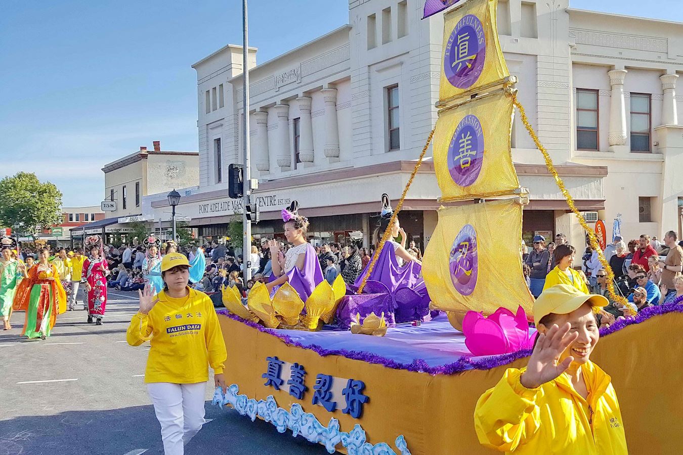 二零一九年十一月十六日和二十三日(周六),法轮功学员参加了阿德莱德港(Port Adelaide)和诺伍德市(Norwood)传统的圣诞花车游行庆祝活动,受到当地观众和游客的欢迎,有观众表示想要学炼法轮功。