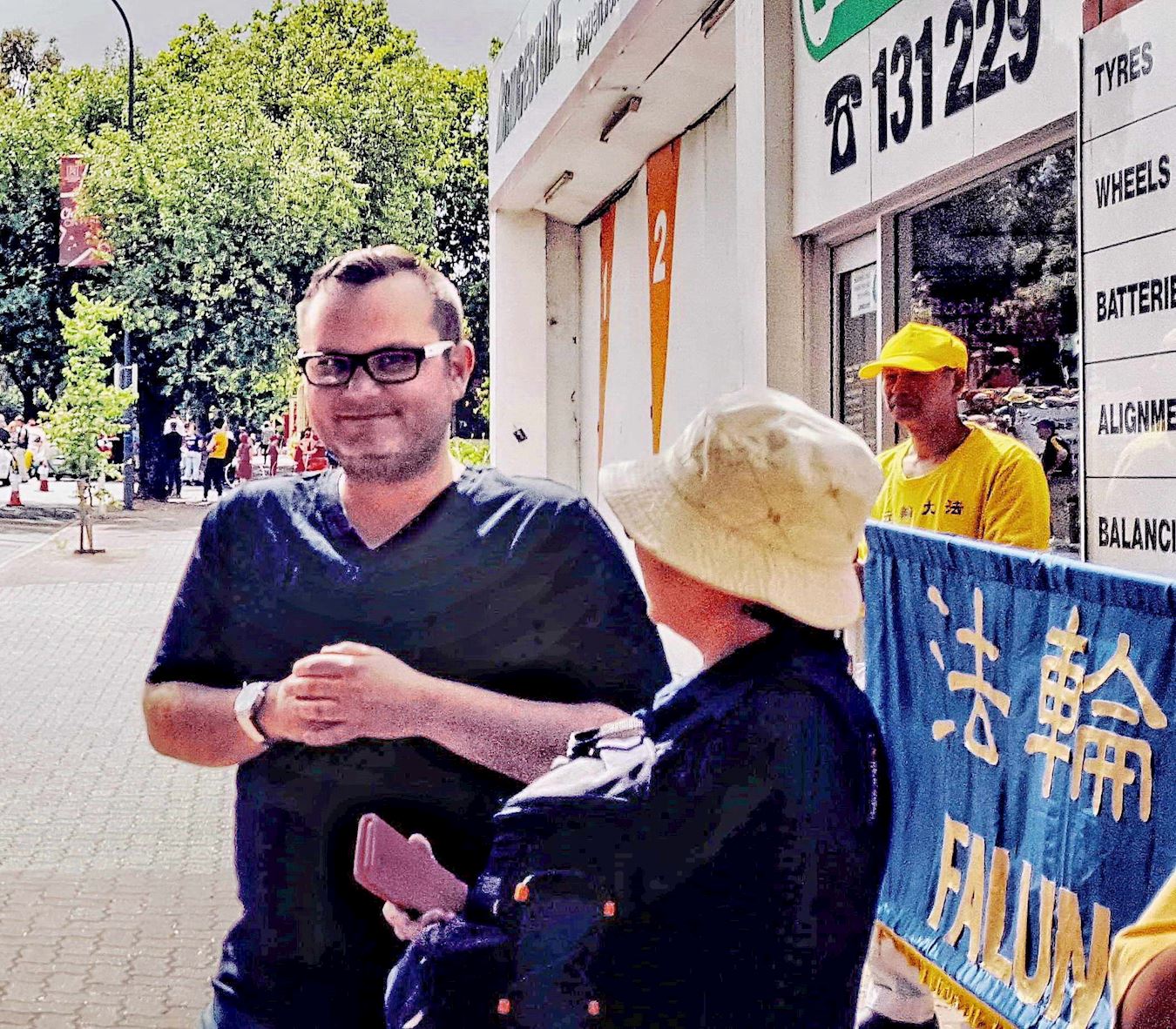 图6:韦德(Wade)很高兴法轮功学员在澳洲可以自由参加社区活动,分享修炼的快乐。