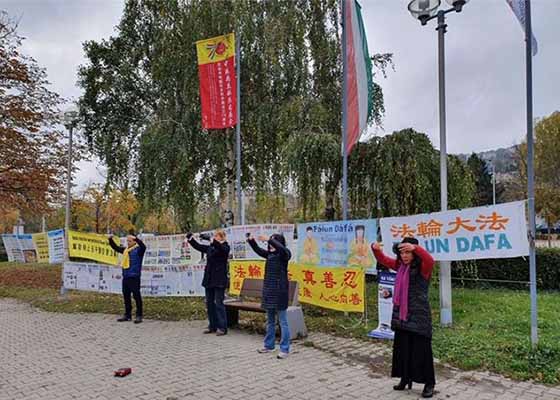 二零一九年世界中医药大会在布达佩斯国会中心举行。法轮功学员在会场外挂真相横幅和展板,演示功法,传播法轮功的真相。