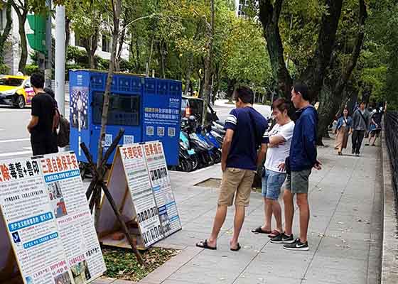 - “法轮功是全世界的!”(图)- 台湾的国父纪念馆是国际知名景点,往来有世界各国旅客、络绎不绝;法轮功学员在园区内有两处真相摊位、也有两处展示五套功法地点,长期向世人传递法轮功真相。