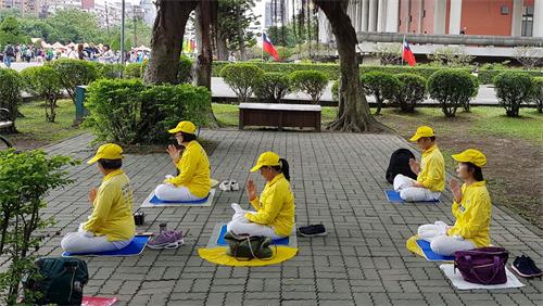 这天有位老导游向团员说明:台湾是民主自由法治的社会,尊重也保障每个人的信仰自由,所以法轮功在这炼功是合法的;你们再看看他们的服装是最整齐划一的、很明显又有朝气吧!团员也随着导游的说明逐渐地绽开了笑脸。