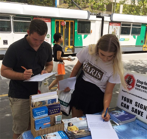 来自珀斯、到墨尔本旅游的高中英语老师朱莉(Julie),之前从媒体报道中了解到中共系统性的活摘法轮功学员器官的指控。她在征签表上签字后说:“中共(医生)在可怕的情况下对法轮功学员进行手术摘取器官,罔顾他们的死活,还强迫法轮功学员改变信仰。我们必须促使中共停止非人的迫害。”