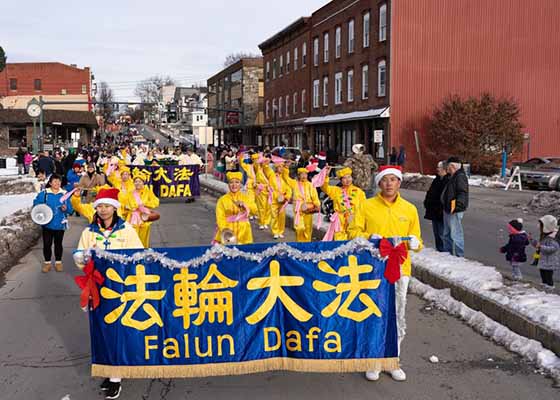 - 纽约上州圣诞游行 民众赞真善忍普世价值(图)- 12月8日,纽约上州雪后天晴,杰维斯港,迎来了当地的第48届三州商会圣诞游行。法轮大法团体再次受邀参加,共襄盛举,并获主办方颁发“最大方阵奖”。