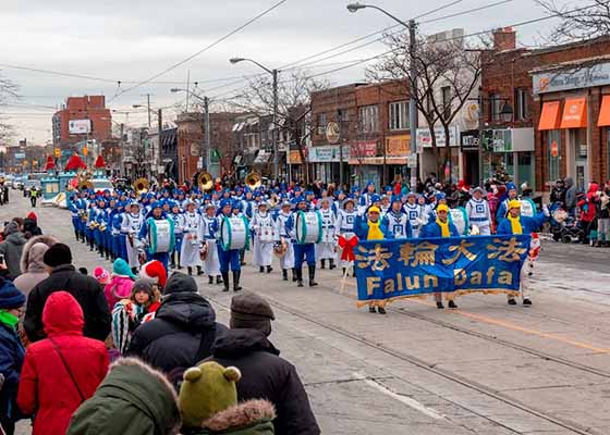 - 加拿大圣诞游行 观众赞法轮功队伍最壮观(图)- 十二月七日,由多伦多法轮功学员组成的天国乐团应邀参加了两场圣诞游行,一场是上午十一点的湖岸怡陶碧谷圣诞游行,另一场是下午五点的佩里港圣诞游行。