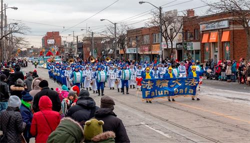 【明慧网二零一九年十二月十一日】(明慧加拿大多伦多记者站报道)二零一九年十二月七日(星期六),由多伦多法轮功学员组成的天国乐团应邀参加了加拿大的两场圣诞游行,一场是上午十一点的湖岸怡陶碧谷圣诞游行(Lakeshore Etobicoke Santa Claus Parade),另一场是下午五点的佩里港圣诞游行(Port Perry Santa Claus Parade)。伴着圣诞的喜庆气氛,天国乐团的方阵受到了当地民众的欢迎及热情响应。有华人观众表示,法轮功队伍是自己在整场游行中看到的最壮观的方阵;西人观众称法轮功的队伍让自己感受到巨大的能量。