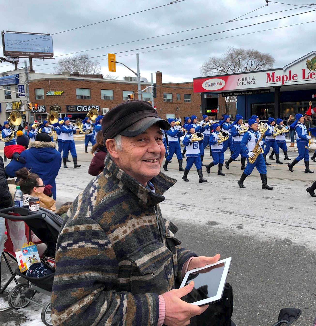 图6:马可先生(Marco右二)和家人一起观看游行并对天国乐团欢呼。