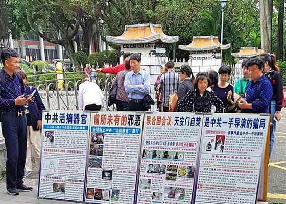 - 女导游:记得把党也退了(图)- 阳光灿烂、晴朗无云,来到国父纪念馆参观并享受冬阳露脸的各国旅客也络绎不绝;法轮功学员继续坚持在国父纪念馆的园区内传播法轮功真相及演示功法。