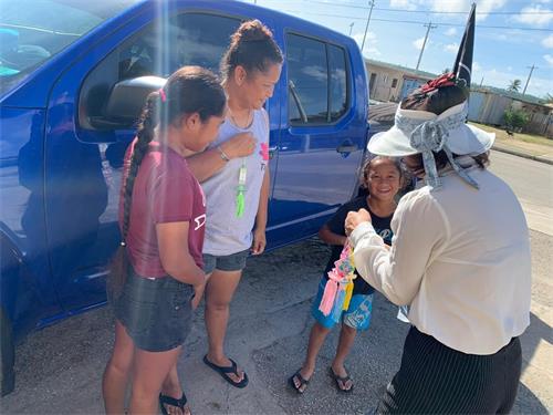 罗塔岛因为人烟稀少,下了飞机,学员们对遇到的民众都传递了大法的美好并赠送了莲花和英文大法的宣传资料。学员们还租了辆车,根据当地情况分两批人,在超市与人流汇集多的地方去传播法轮功真相。