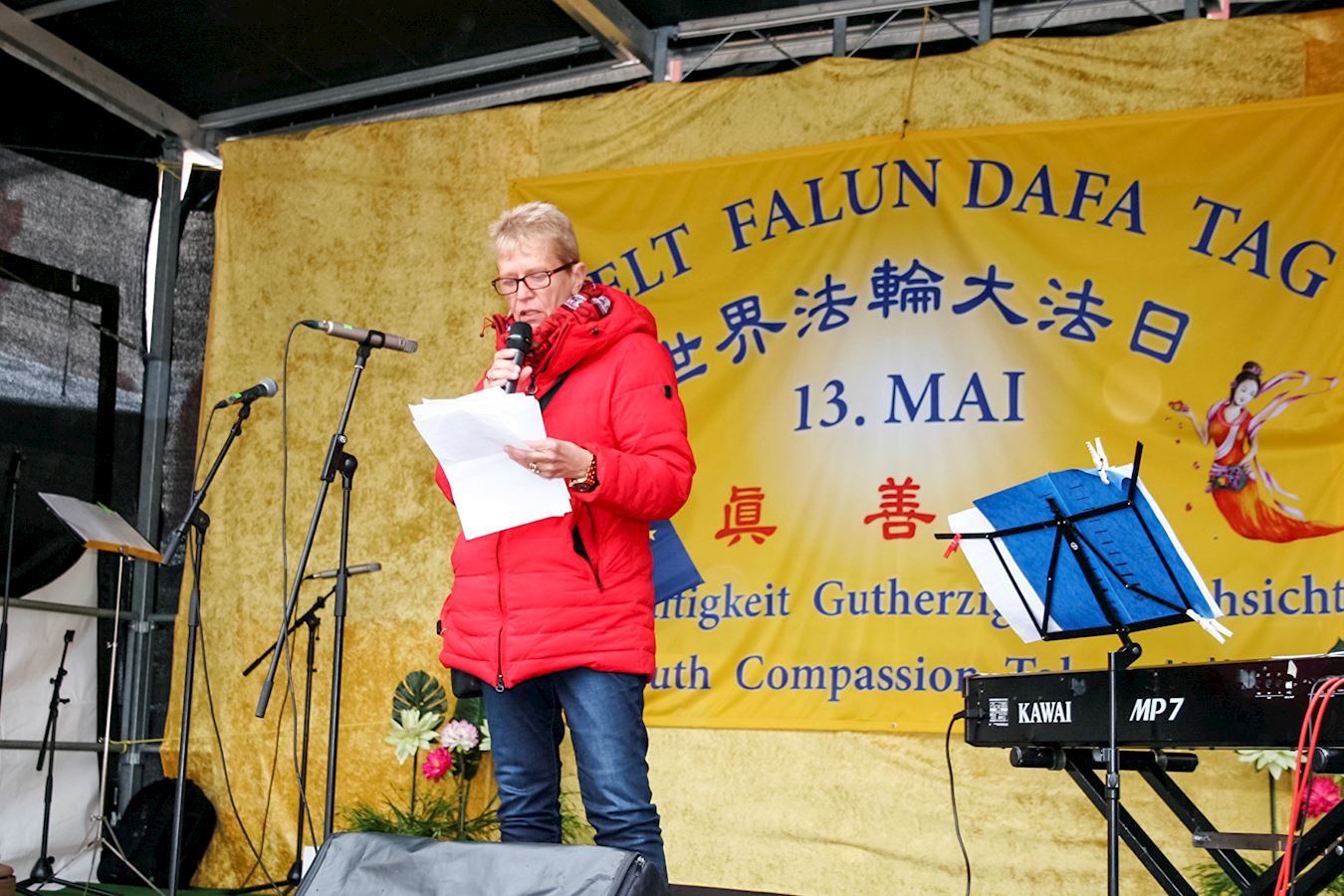 图2:尼森女士于2019年5月11日在法兰克福参加德国法轮功学员庆祝“世界法轮大法日”活动,并发言祝贺