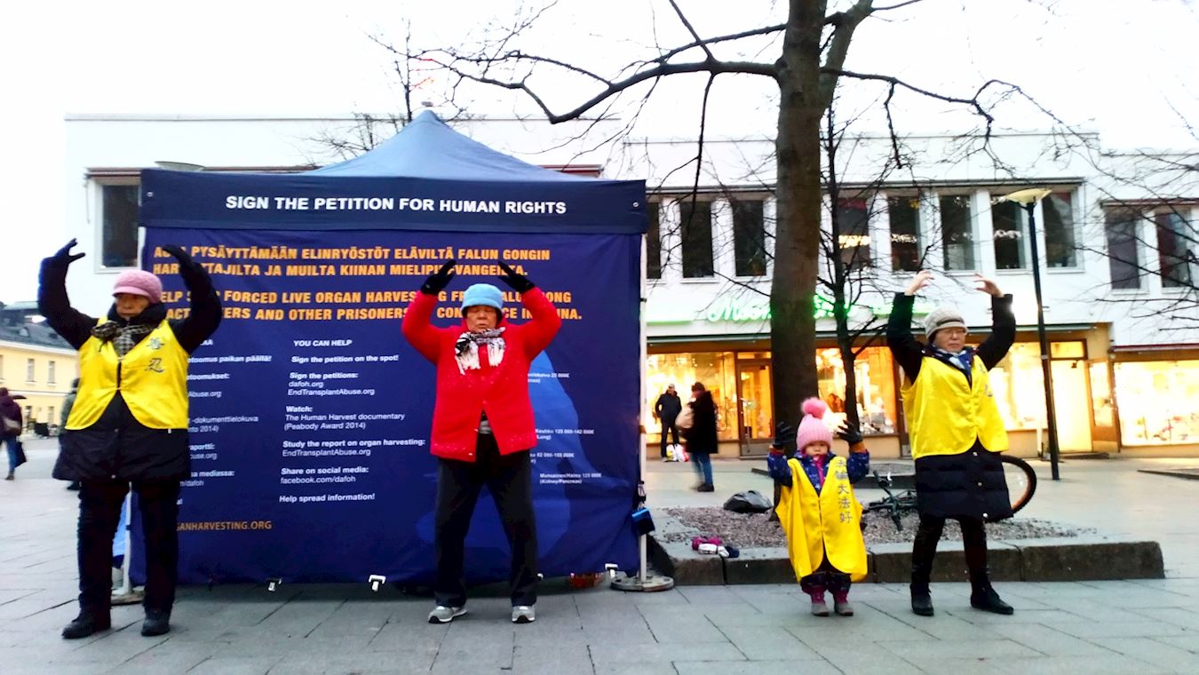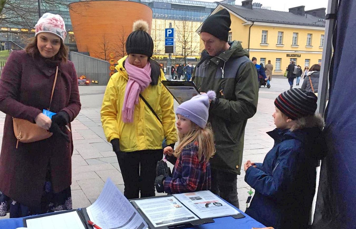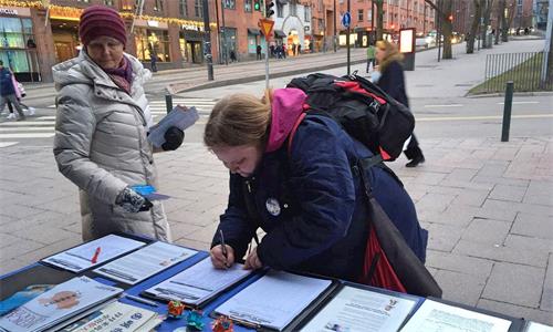 莉亚(Lia)来自芬兰, 玛雅(Maja)来自瑞典, 塞缪尔(Samuel)来自荷兰,他们一同出来购物。莉亚告诉学员,她在荷兰的一个广场上了解到法轮功的真相,而且在征签表上签了名。她说:“我们一定要做点什么。”玛雅则说:“我在瑞典也看见过你们的信息。”