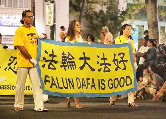 - 夏威夷法轮功学员参加感恩节大游行(图)- 2019年11月29日傍晚,数以万计的民众在夏威夷檀香山市最著名的景点威基基海滩附近的卡拉卡瓦大道举行盛大节日游行,欢庆感恩节。