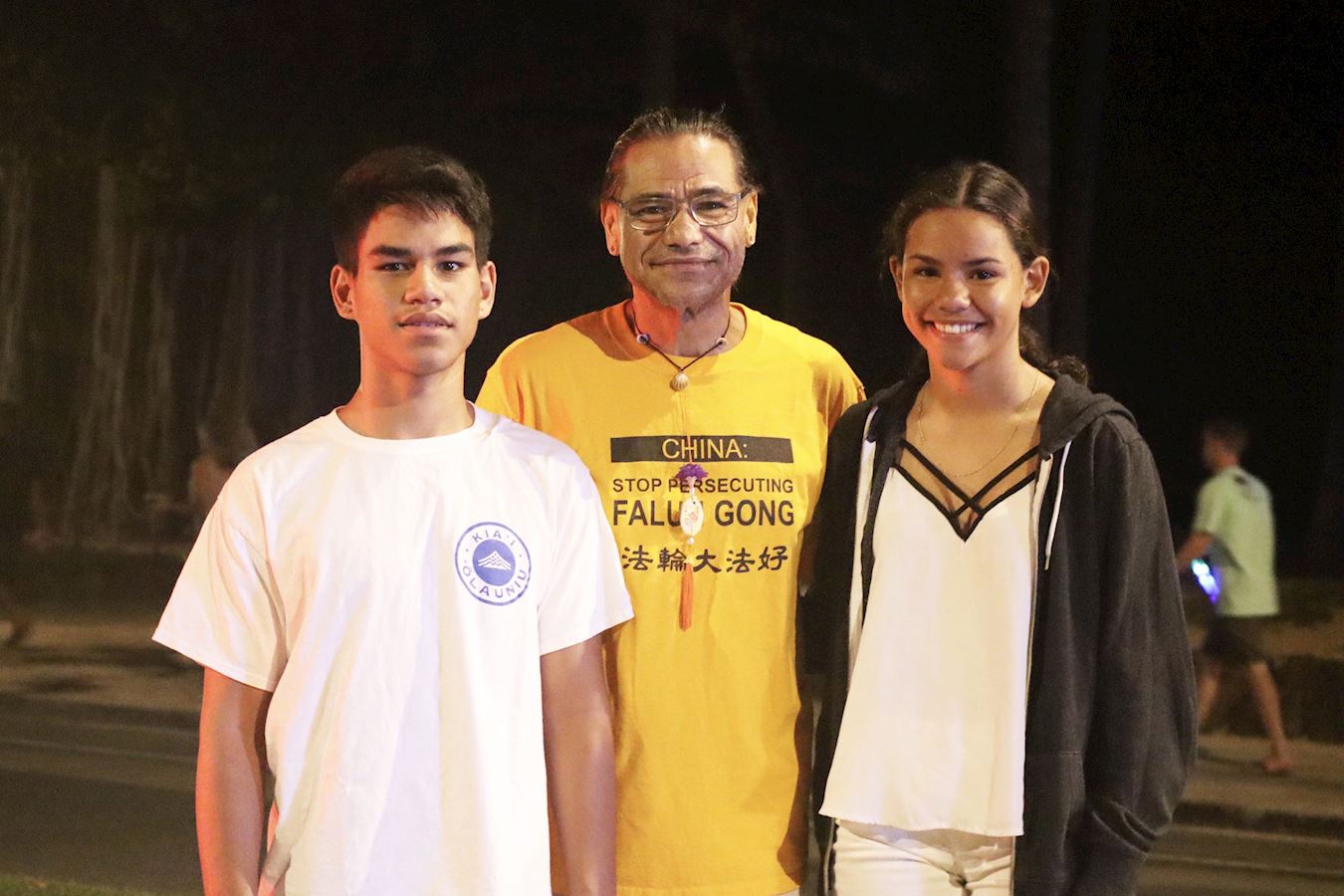 12岁的法轮大法小弟子娜海(Nahe)和17岁的哥哥凯奥(Kahiau)与爸爸罗伯特(Robert Quartero)一同参加了本次大游行,这也是她和哥哥第一次参加这样盛大的游行,以前都是作为观众,这一次却成为游行参与者,令这对兄妹兴奋不已。娜海修炼法轮功两年半的时间了,几乎每个周末她和哥哥都会和当地其他的法轮功学员到阿拉莫阿纳海滩公园(Ala Moana Beach Park)的法轮功炼功点炼五套功法,娜海表示,炼功以后,让她学习更加专注,而法轮大法的书籍则令她在做人处事上受益匪浅。