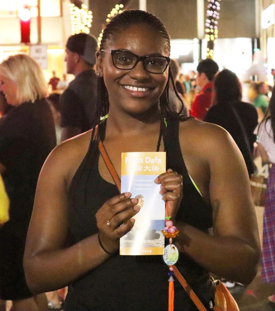 参观游行的观众中有游客,也有每年必来的当地民众。非裔女孩儿Nia Liberty表示自己是第一次听说法轮功,她非常高兴接收到法轮功的传单,她认为能在这里看到法轮功的队伍非常开心,回家后一定会好好阅读一下法轮大法的网站,了解法轮功。