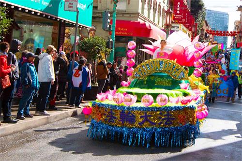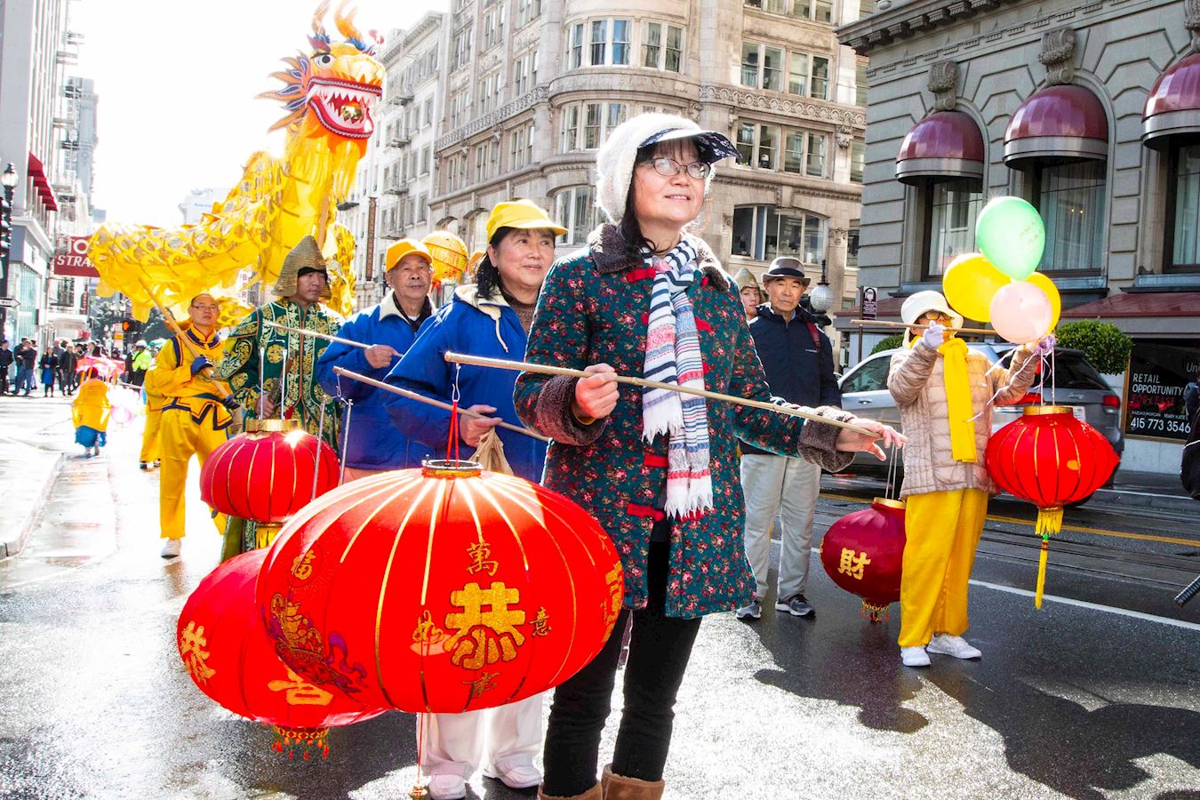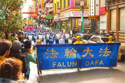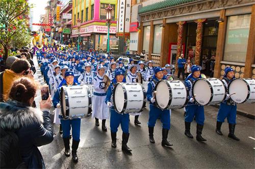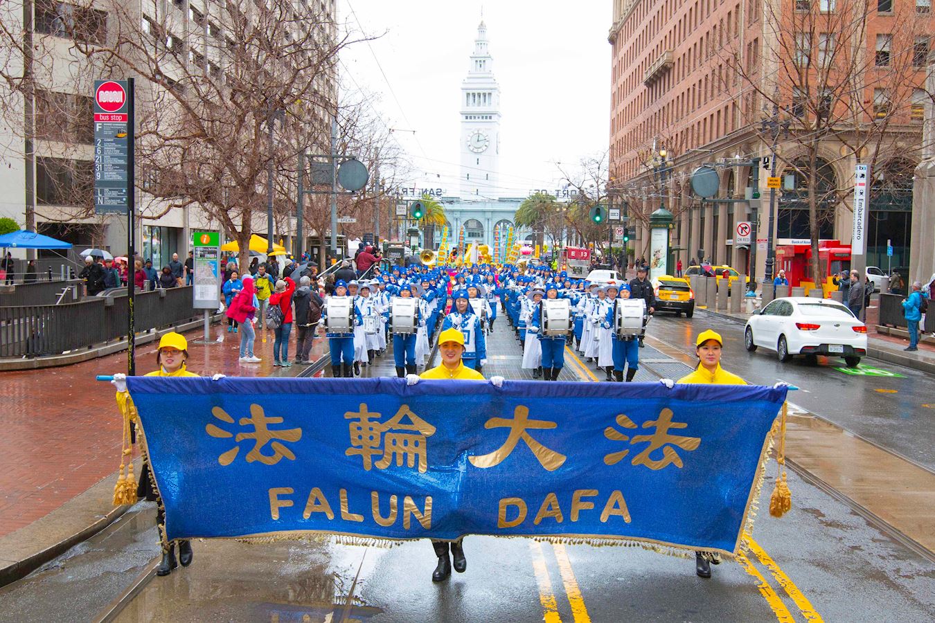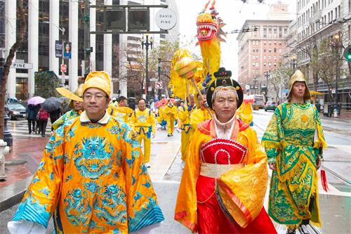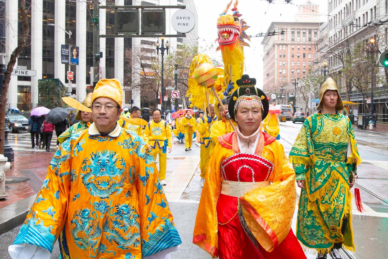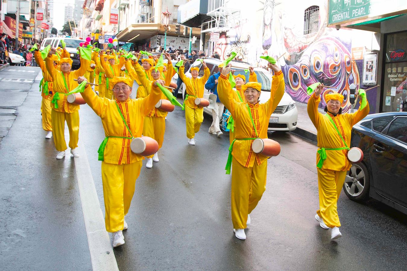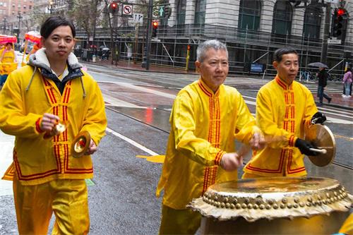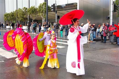 开道的天国乐团身着蓝白相间的传统古装,以嘹亮的鼓乐送上了新年的祝福。沿途不少观众冒雨观看游行。原本下雨的天空在法轮功的队伍接近中国城时,变得清亮起来,阳光明媚。