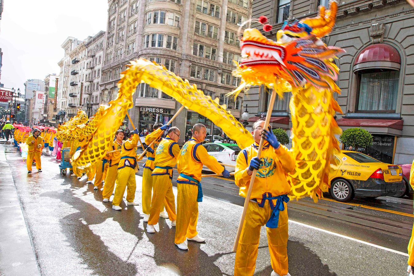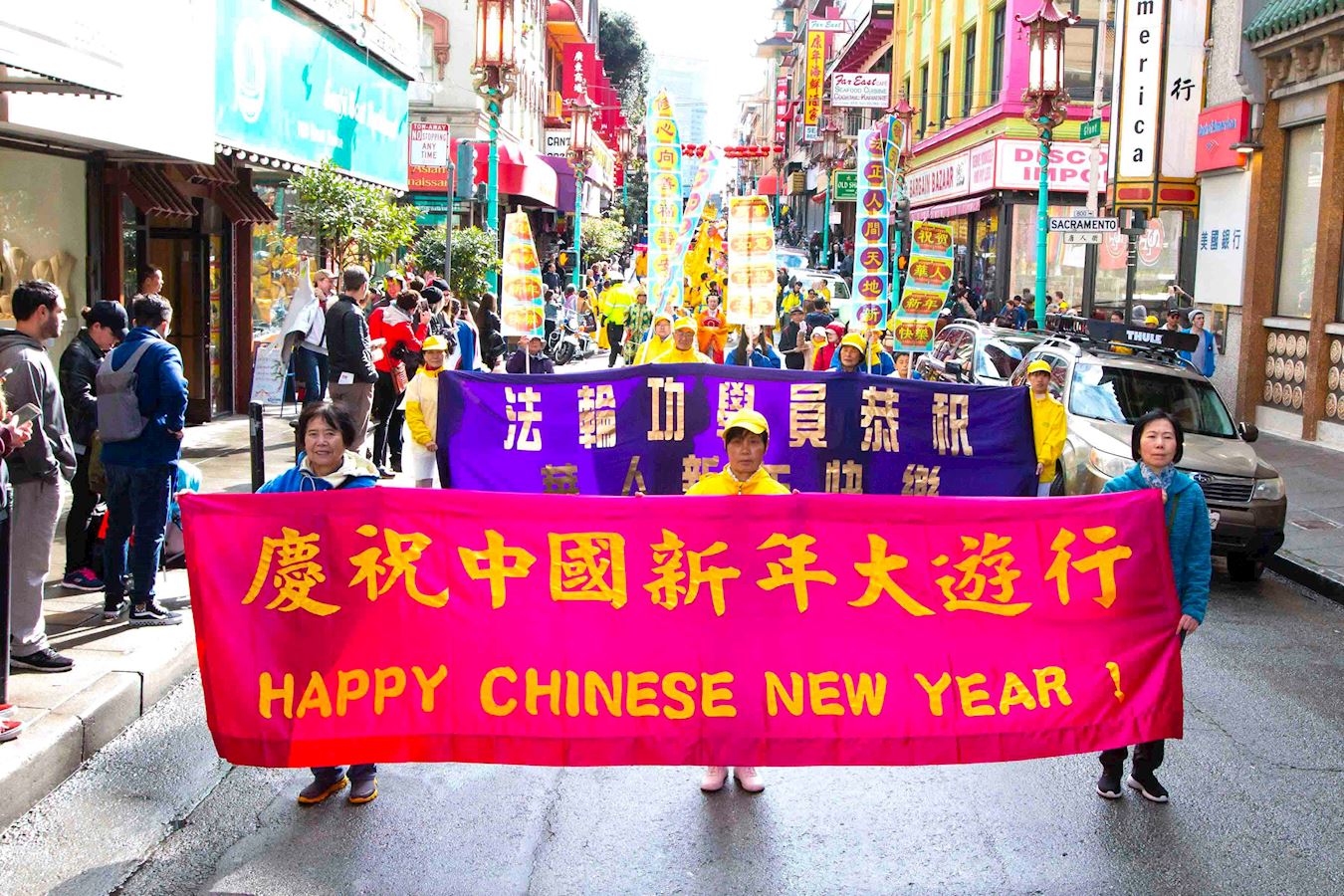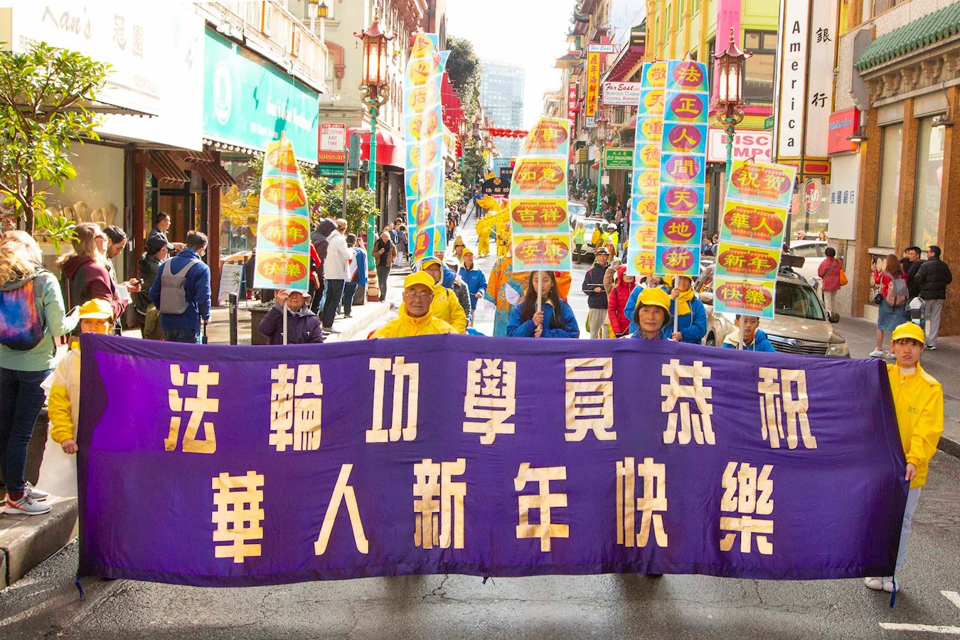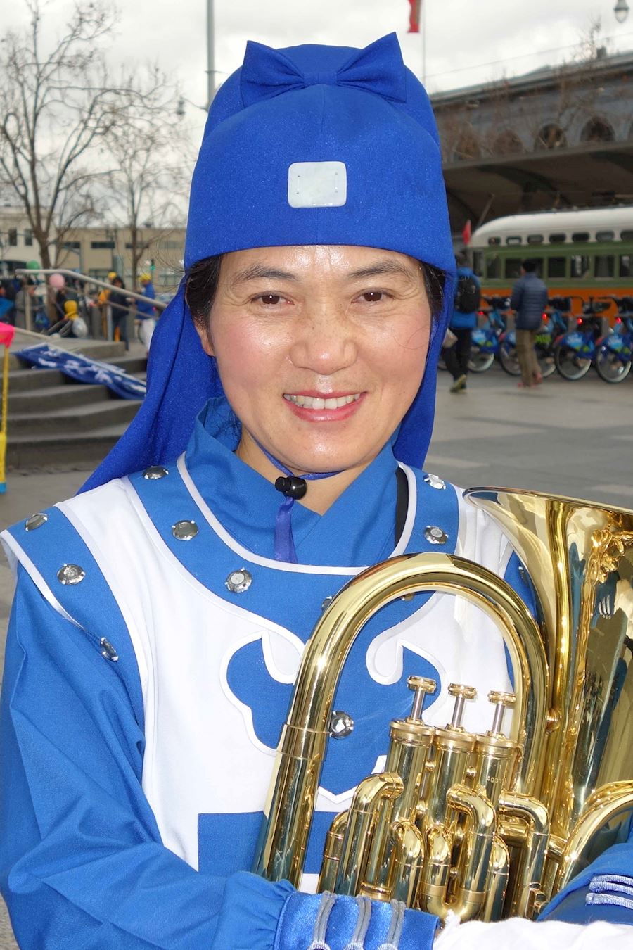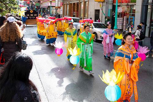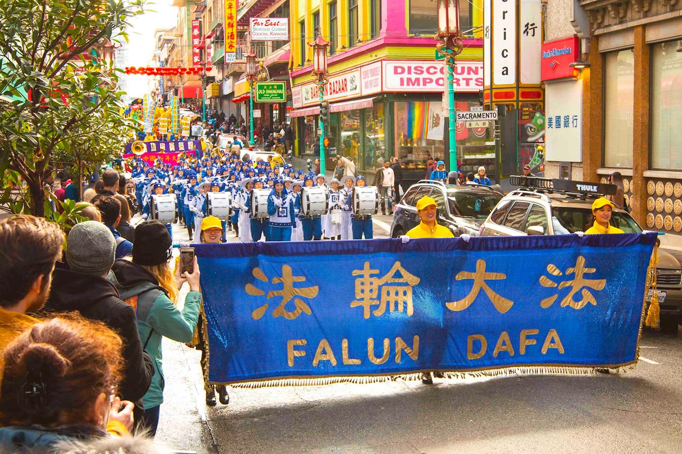 开道的天国乐团身着蓝白相间的传统古装,以嘹亮的鼓乐送上了新年的祝福。沿途不少观众冒雨观看游行。原本下雨的天空在法轮功的队伍接近中国城时,变得清亮起来,阳光明媚。