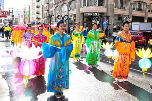 这时,下雨的天空变得晴朗,阳光明媚。法轮功学员的队伍,伴随着美丽的花车驶过,身穿民族服装的少女翩迁起舞,分外醒目。