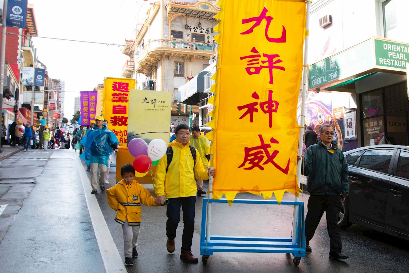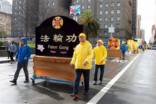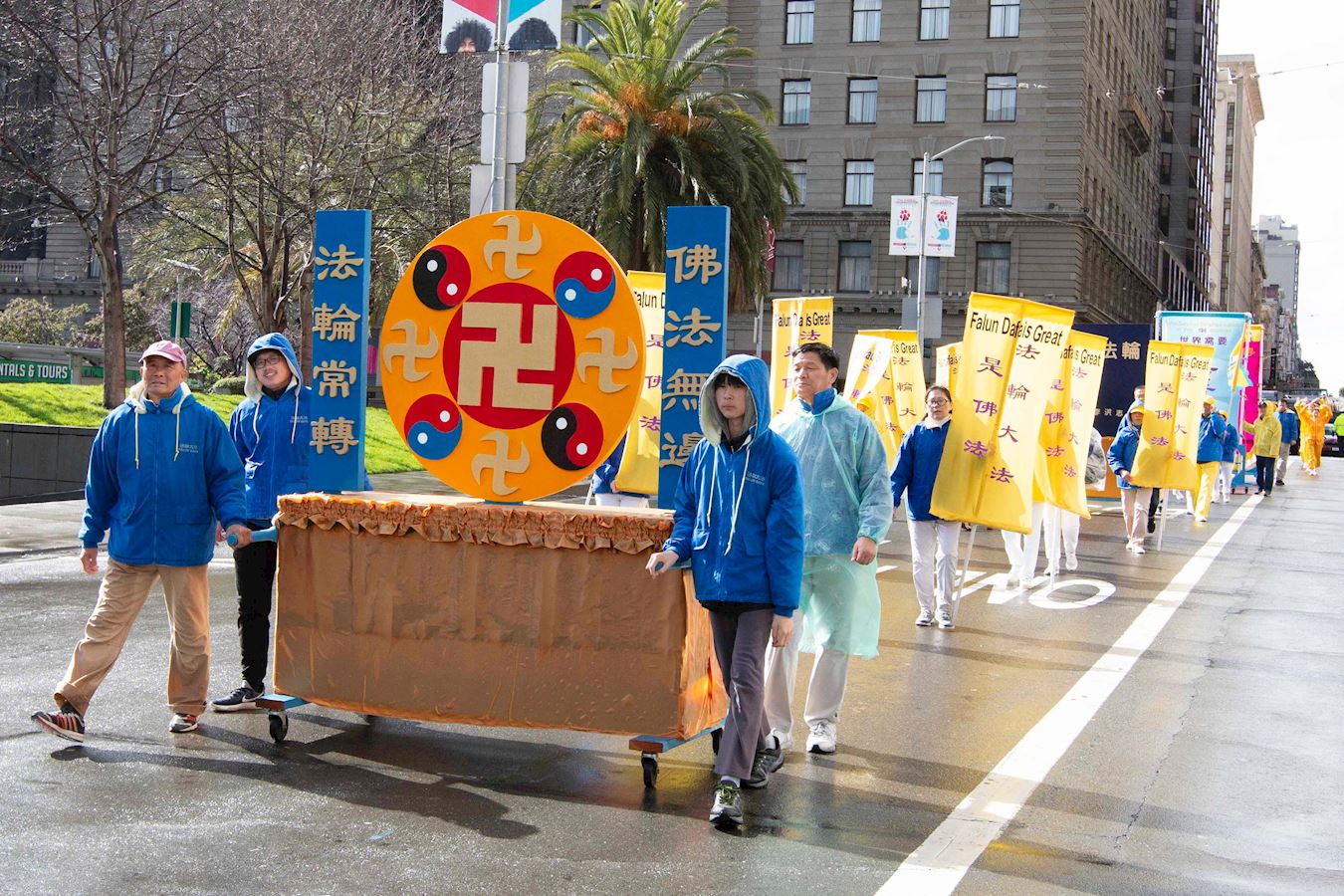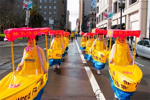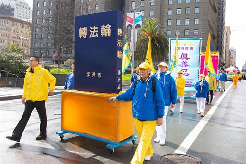 中午十二点,由旧金山法轮大法修炼者和支持者组成的游行队伍冒雨从旧金渡轮大厦前的广场出发。走在最前面的是美西法轮大法天国乐团,紧接在后的舞龙队、小花船和仙女队。第二方阵是法轮大法好,由车旗队、横幅队、炼功队、花车和各民族队伍组成。第三方阵是明白真相得福报。第四方阵是三大媒体的队伍、气球队和腰鼓队组成。最后一个方阵是讲真相、九评退党队。